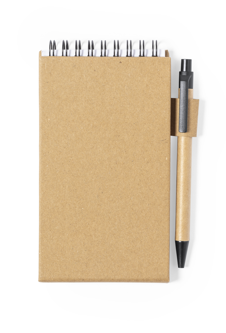 Bloc de notas de línea nature convertible en soporte para smartphone y fabricado en cartón reciclado. Incluye: Bloc de anillas de 30 hojas blancas, con disposición a una raya y soporte para bolígrafo. Bolígrafo en cartón reciclado con detalles en negro, de mecanismo pulsador y en tinta azul.25 notas adhesivas medianas.125 mininotas adhesivas en varios colores.