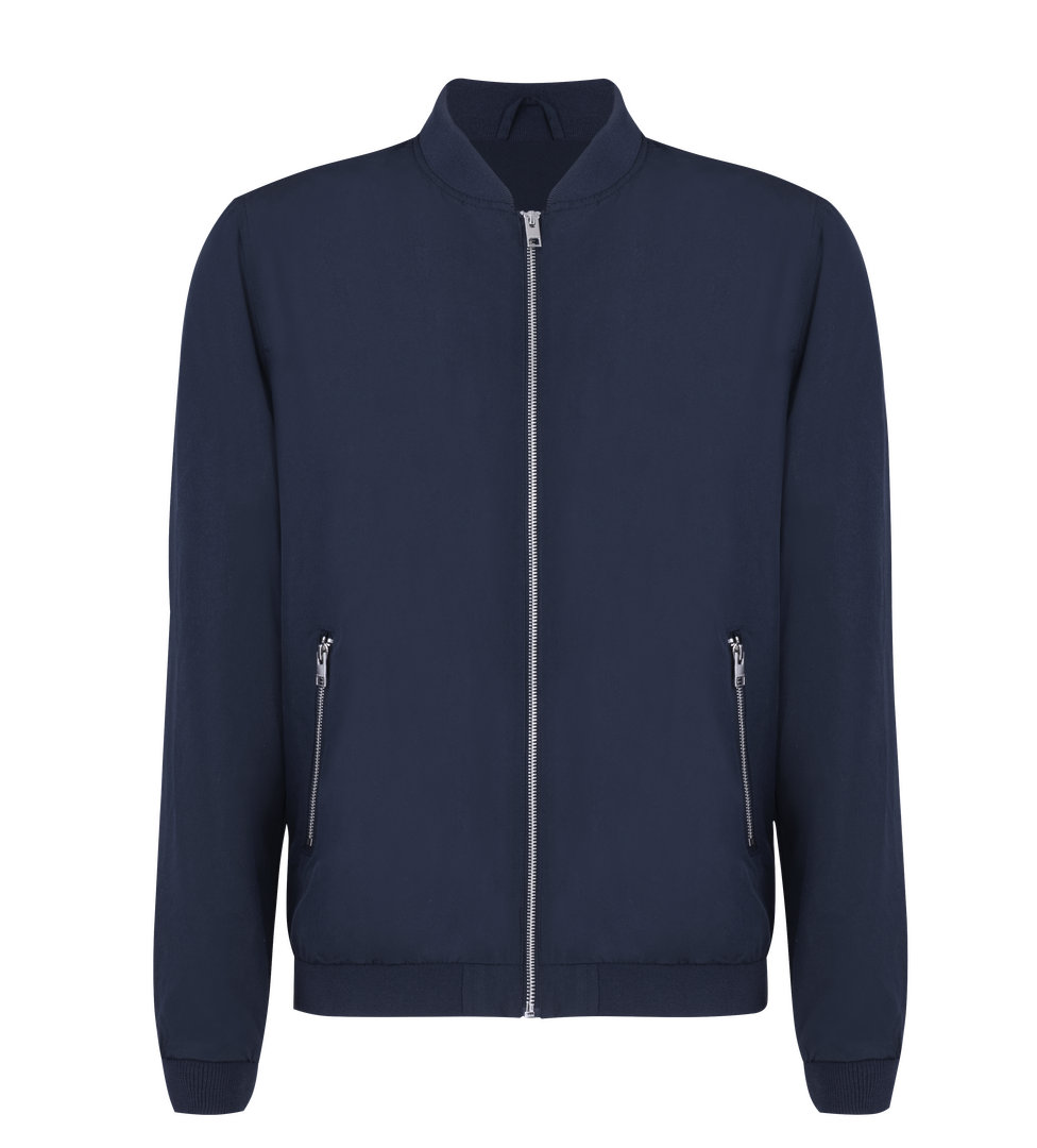 Moderna chaqueta ligera estilo "bomber" con cuello beisbol. Fabricada en cálido poliéster, con forro interior y resistente al viento y al agua. En elegantes colores azul marino y marrón, que destacan por sus cremalleras estilo cromado en frontal y bolsillos. Con ribete elástico en puños y bajo. Tallas XS, S, M, L, XL, XXL.