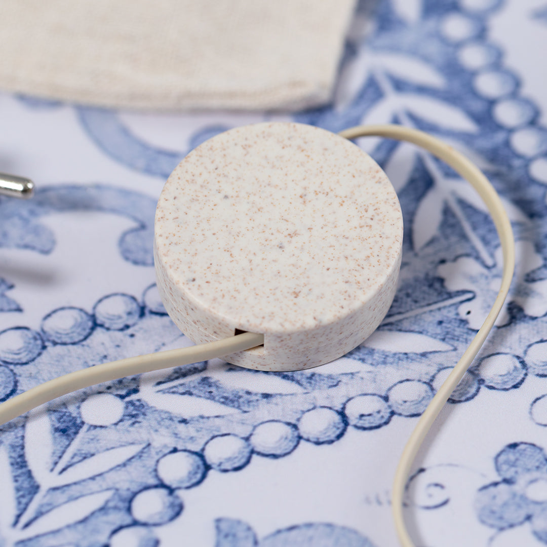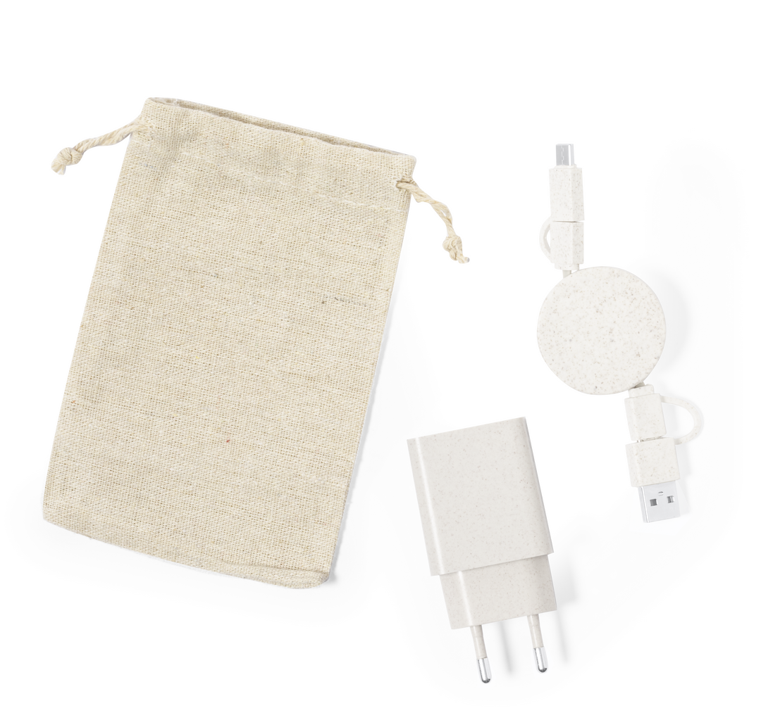 Set de cargador USB de pared con carga rápida y cable cargador con transferencia de datos, fabricados en fibra de trigo. Cargador con salida USB y Tipo C, y cable extensible con conexión Micro USB, Tipo C y Lightning. Enchufe europeo. Presentado en bolsa de algodón crudo 100% natural, con cierre de cordón.La caña de trigo fomenta la utilización de materias primas naturales, reduciendo así las emisiones contaminantes.