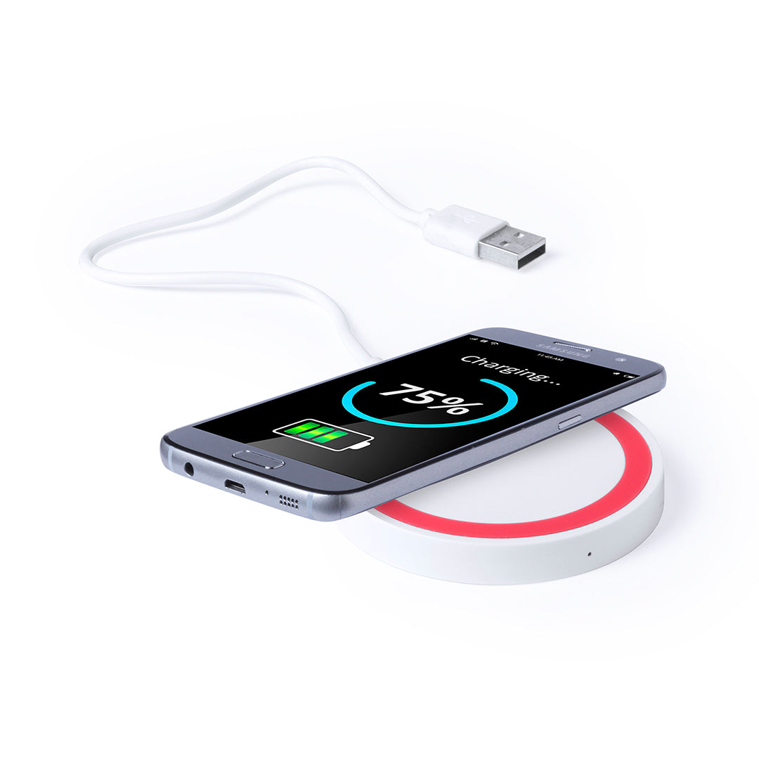 Cargador inalámbrico circular de diseño bicolor. Con base antideslizante e indicador LED de estado de carga. Compatible con smartphones con tecnología de carga inalámbrica y presentado en atractiva caja de diseño.