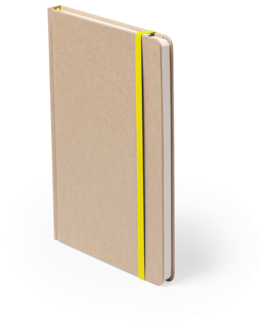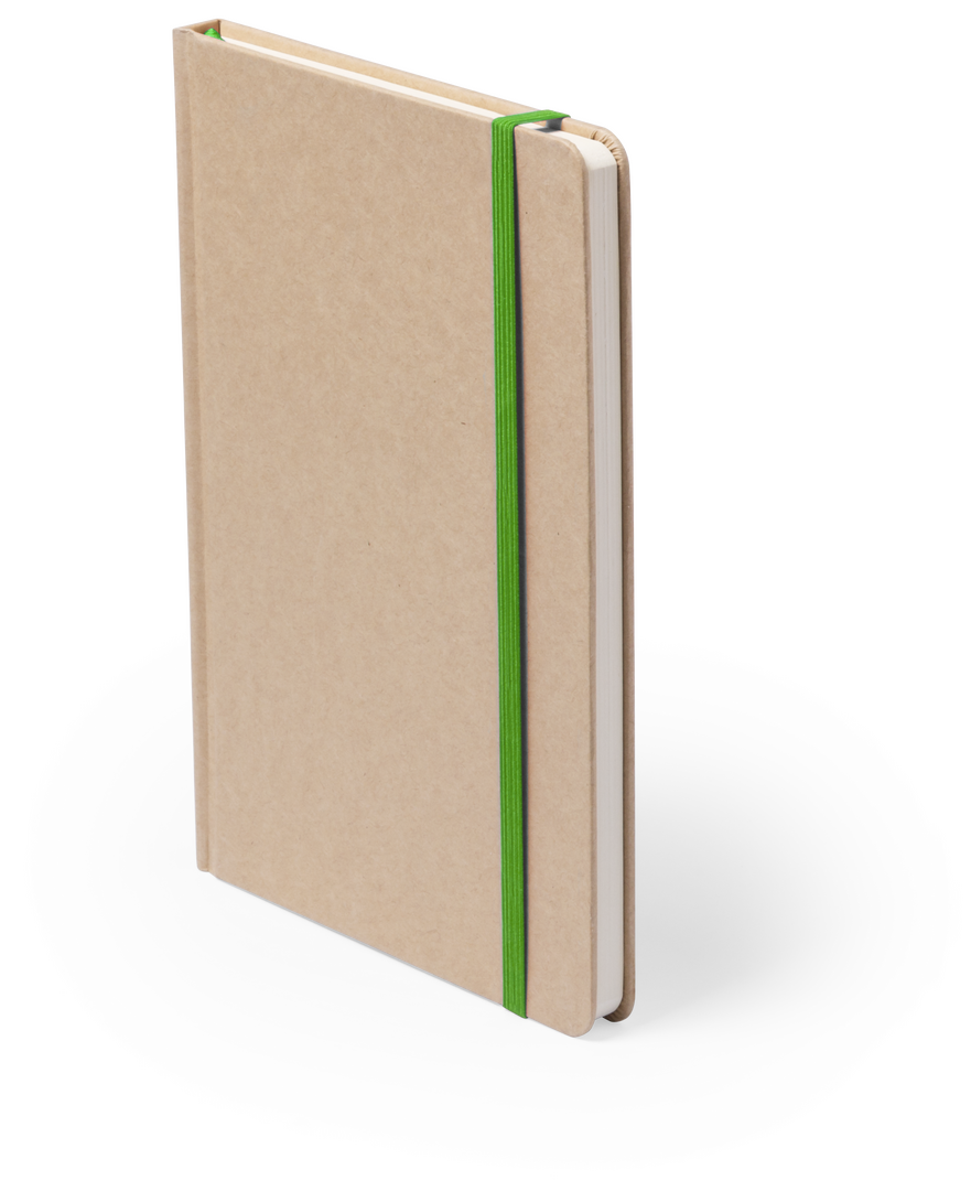 Bloc de notas A5 con tapas duras en resistente cartón reciclado. De 100 hojas blancas lisas y banda elástica para su cierre. Disponible en variada gama de colores.