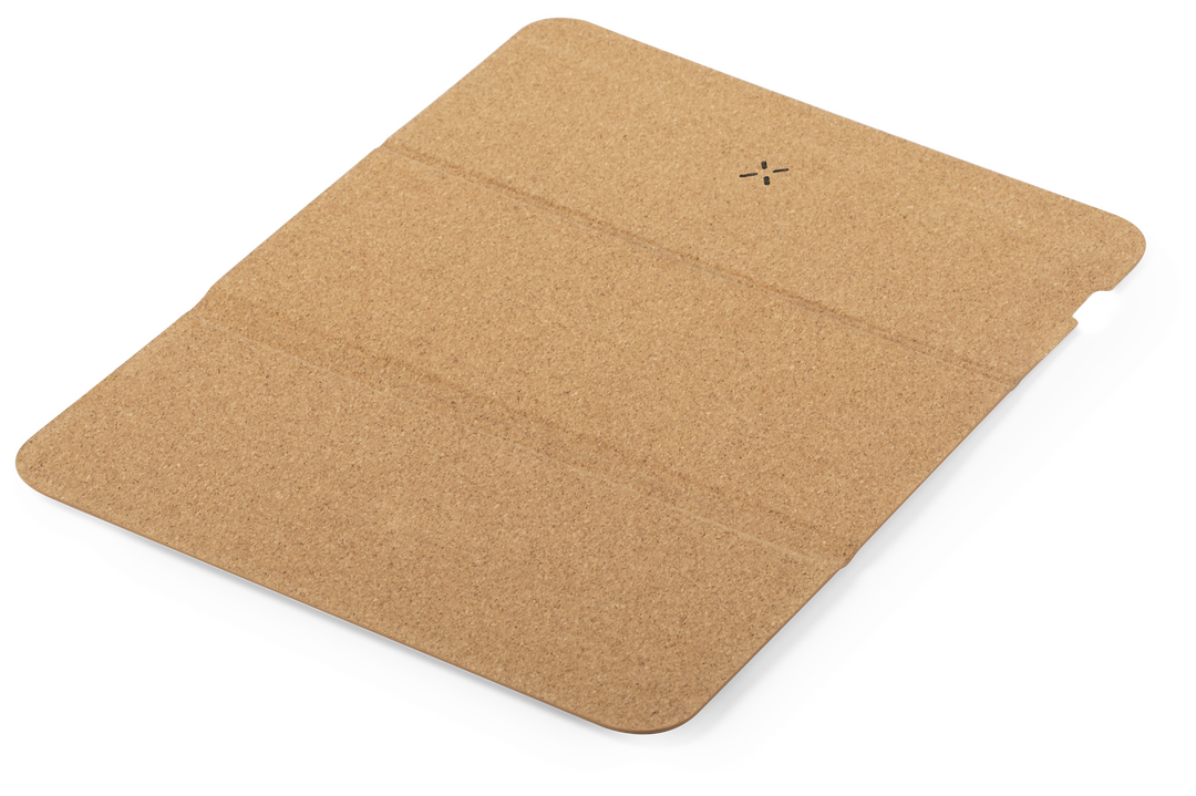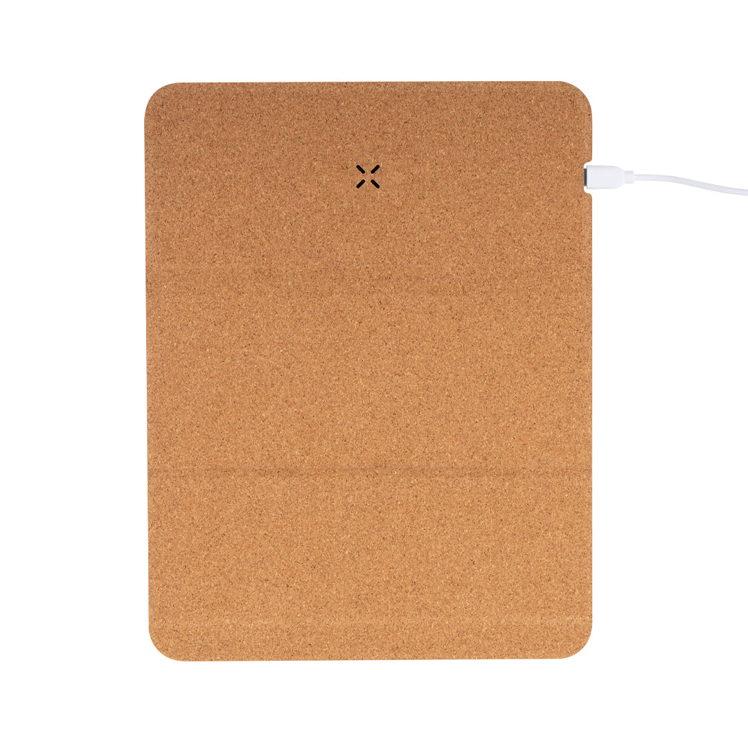 Alfombrilla de línea nature en corcho natural. Con cargador inalámbrico integrado -cable Tipo C incluido-, base antideslizante y soporte para móvil integrado. Compatible con dispositivos equipados con tecnología de carga inalámbrica y presentada en atractiva caja de diseño eco.