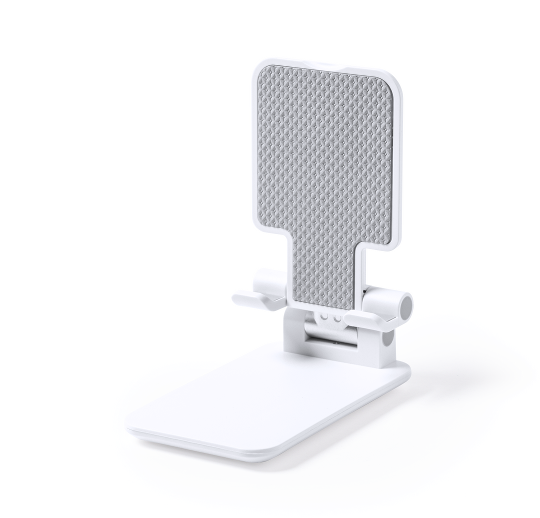 Soporte plegable para smartphones y tablets. Regulable en altura, incluye protecciones de goma antideslizantes en base y soporte. En sobrio acabado de color blanco y con amplia superficie de marcaje, especialmente indicado para impresión en tampografía. Presentado en atractiva caja de diseño.