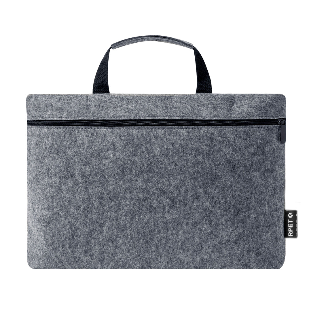 Portadocumentos en resistente fieltro RPET efecto melange. Compartimento principal con cierre de cremallera, para ordenador portátil de hasta 15 pulgadas, y pequeño bolsillo interior. Con resistentes asas a juego con detalles en negro. Logotipo RPET en etiqueta exterior. El fieltro RPET es fruto de la combinación del proceso de reciclaje de materiales plásticos junto con la técnica milenaria de fabricación del fieltro, dando como resultado un material de eco-tendencia que, además de ser de origen reciclado, también se convierte en reciclable.