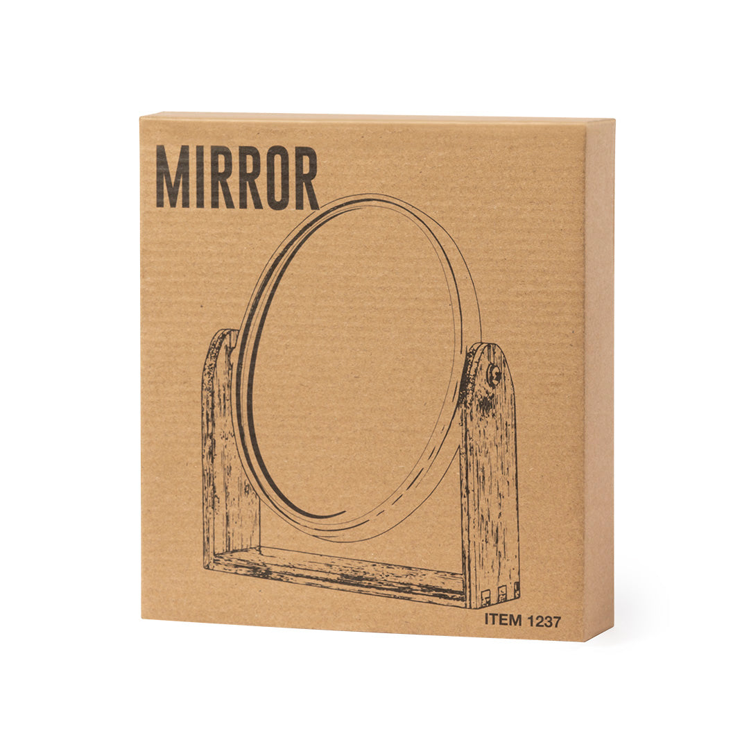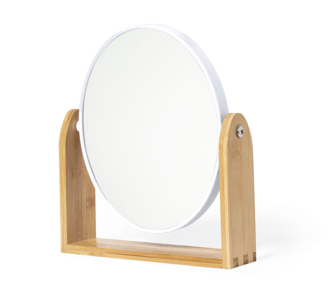 Espejo de sobremesa de línea nature fabricado en bambú. Con dos espejos (1X y 3X). Presentación en caja individual de diseño eco.