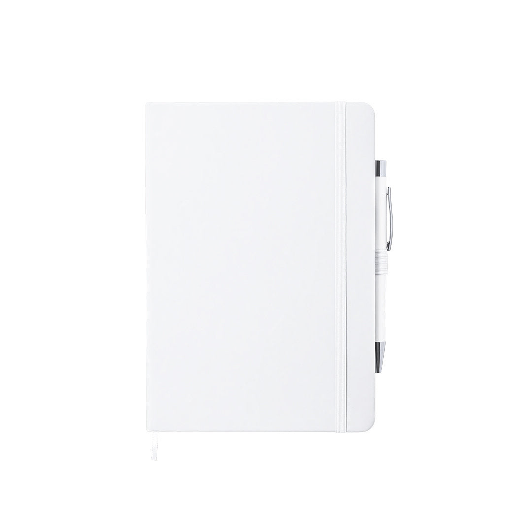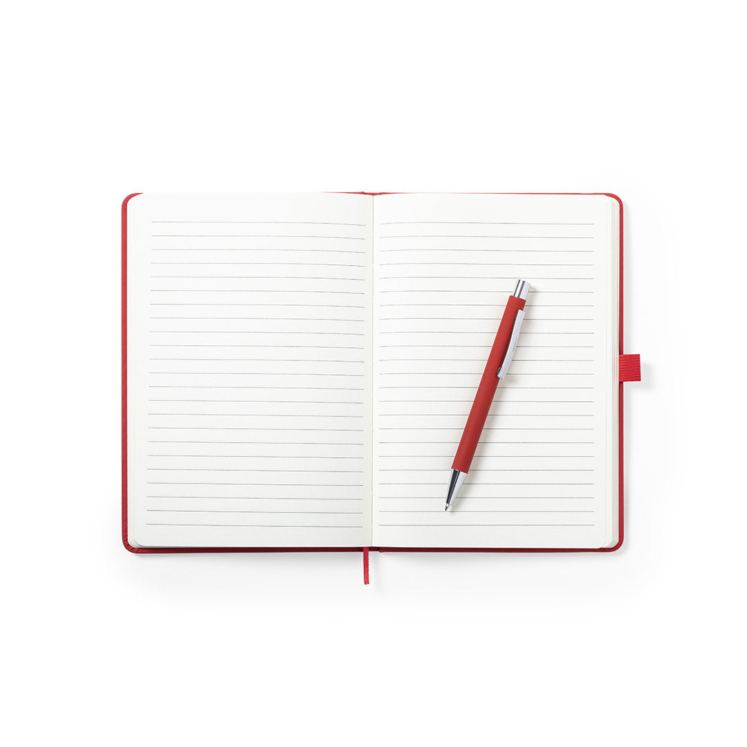 Set de bloc y bolígrafo a juego. Bloc de tapas rígidas con suave tacto acabado en polipiel, incluye soporte para bolígrafo, marcapáginas y cierre elástico, con interior de 100 hojas a una raya. Además, bolígrafo de aluminio en acabado goma con carga jumbo. Disponible en una variada gama de colores.
