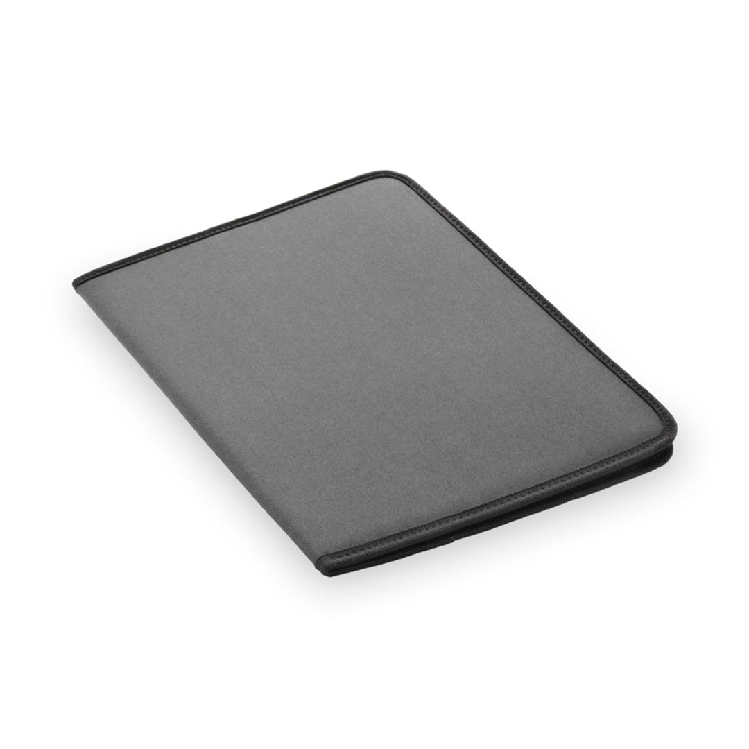 Carpeta en variados colores acabada en resistente poliéster 600D con ribete reforzado en negro. Interior con bloc extraíble de 20 hojas lisas, 2 bolsillos de solapa y soporte para bolígrafo.