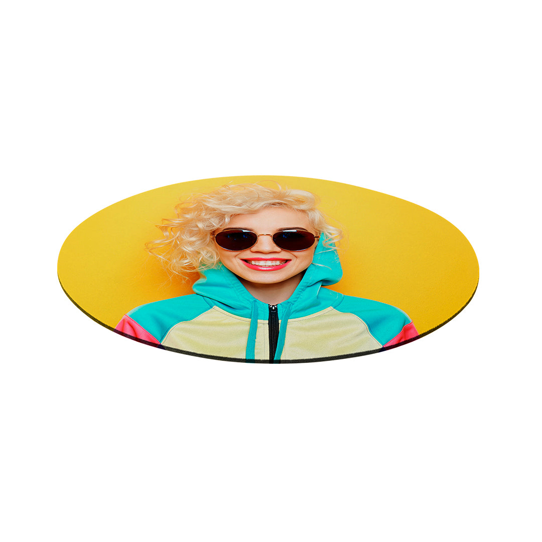 Alfombrilla de diseño circular en suave poliéster de vivos colores y con base antideslizante en silicona.
