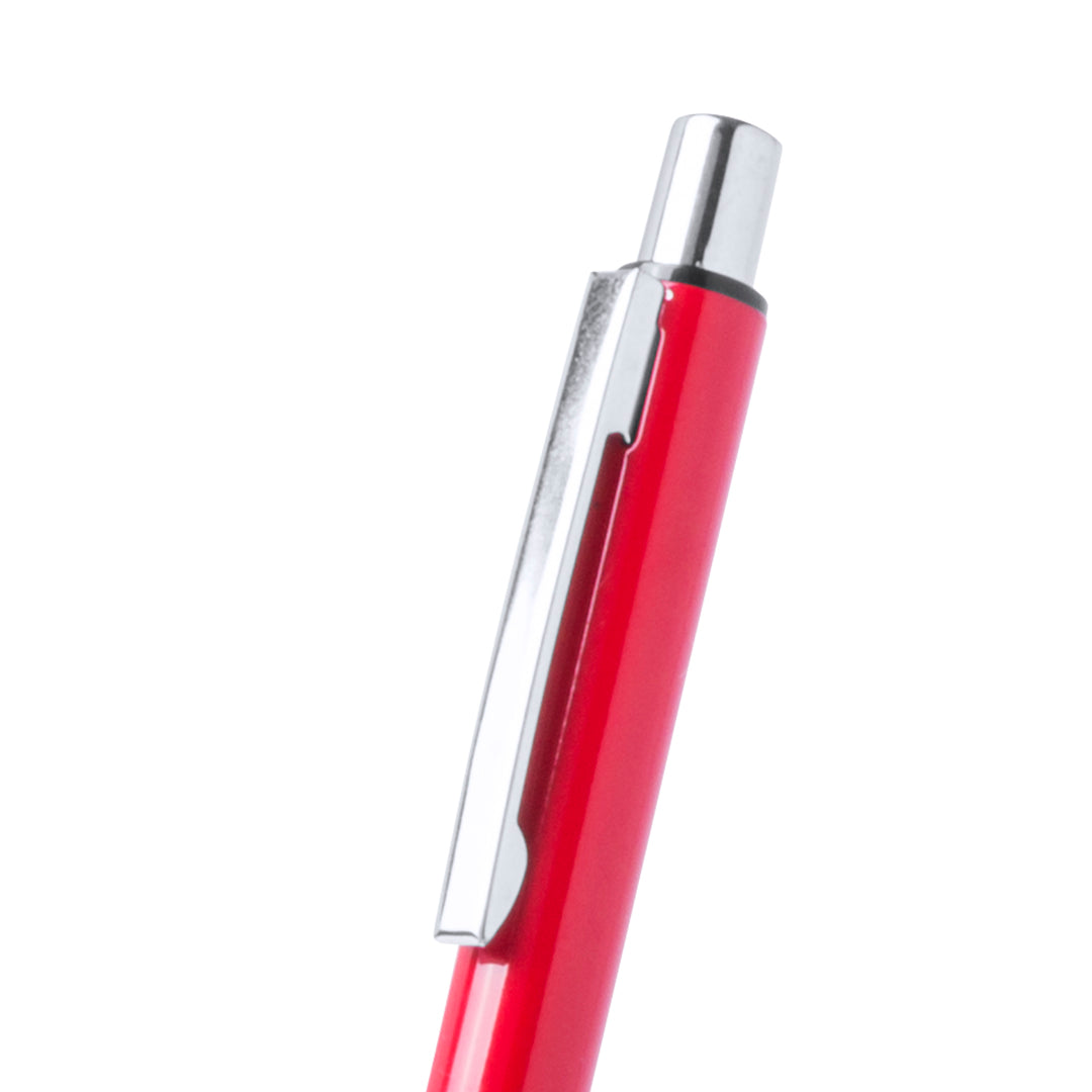 Bolígrafo puntero de mecanismo pulsador en desenfadados colores y con puntero a juego. Acabado en aluminio brillante y tinta negra.