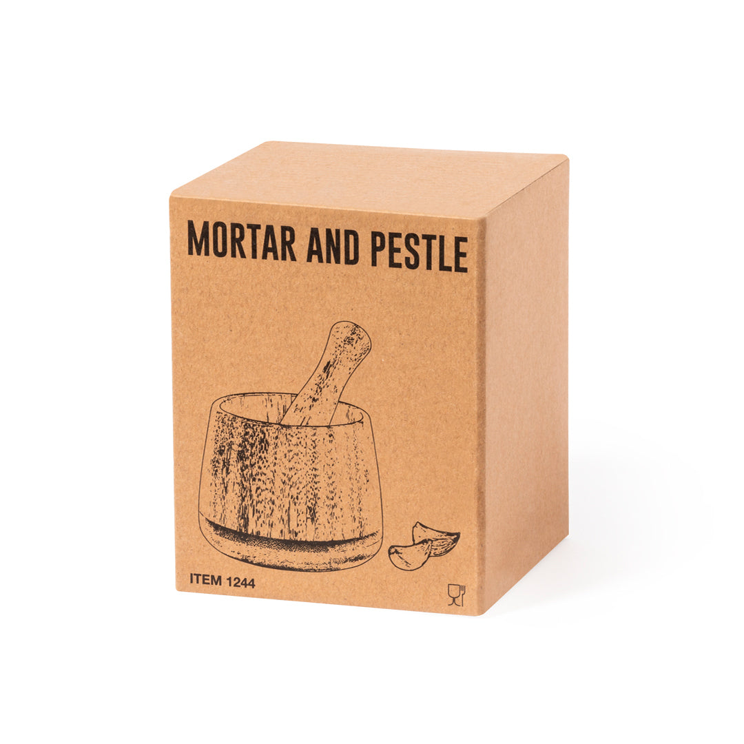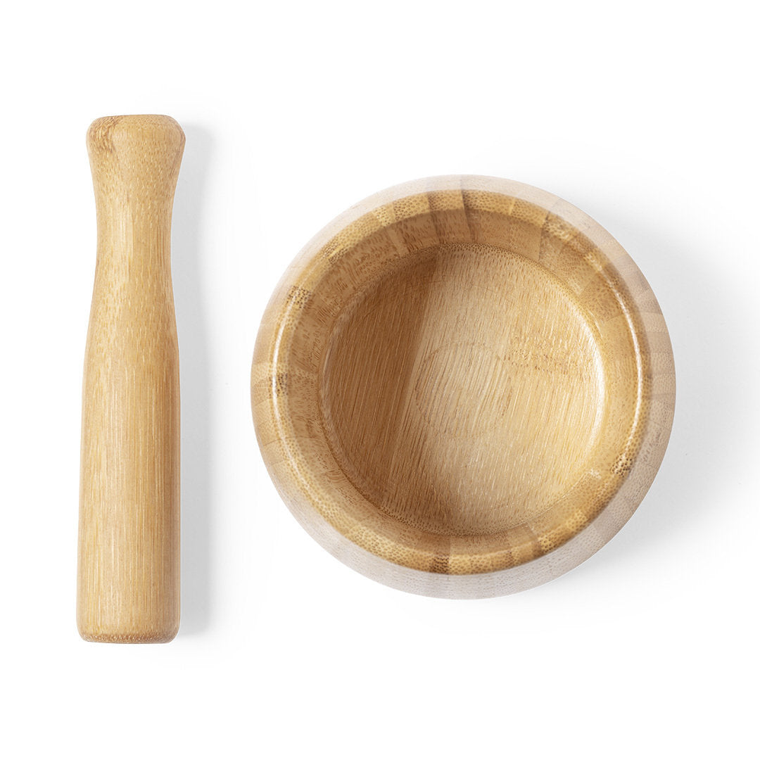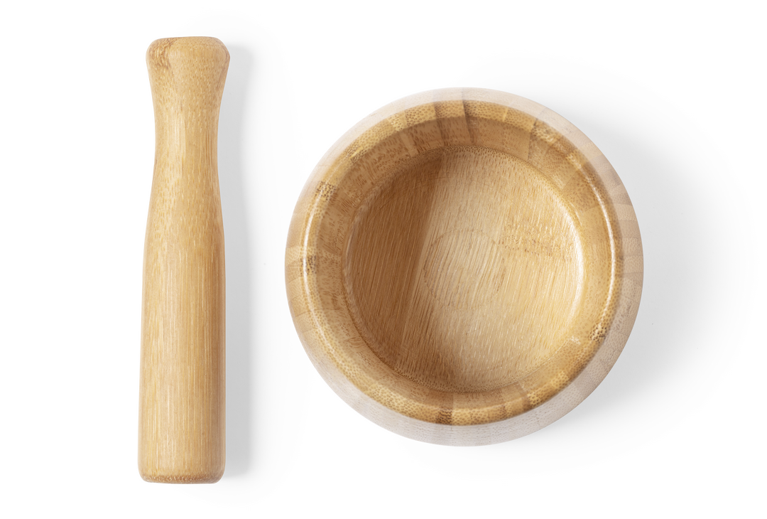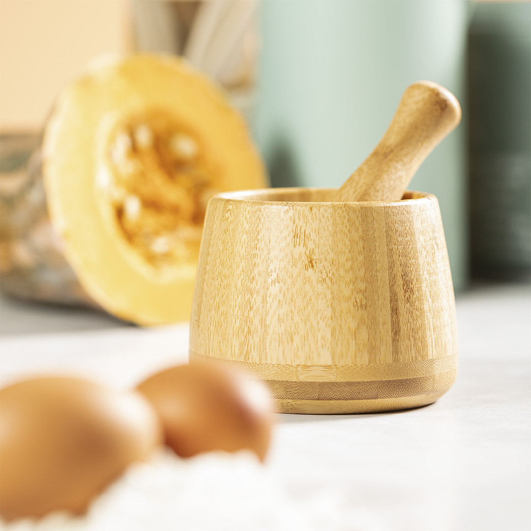 Mortero de línea nature. Fabricado en bambú, para así fomentar el uso de materias primas naturales. Con macerador incluido y presentado en caja individual de diseño eco.