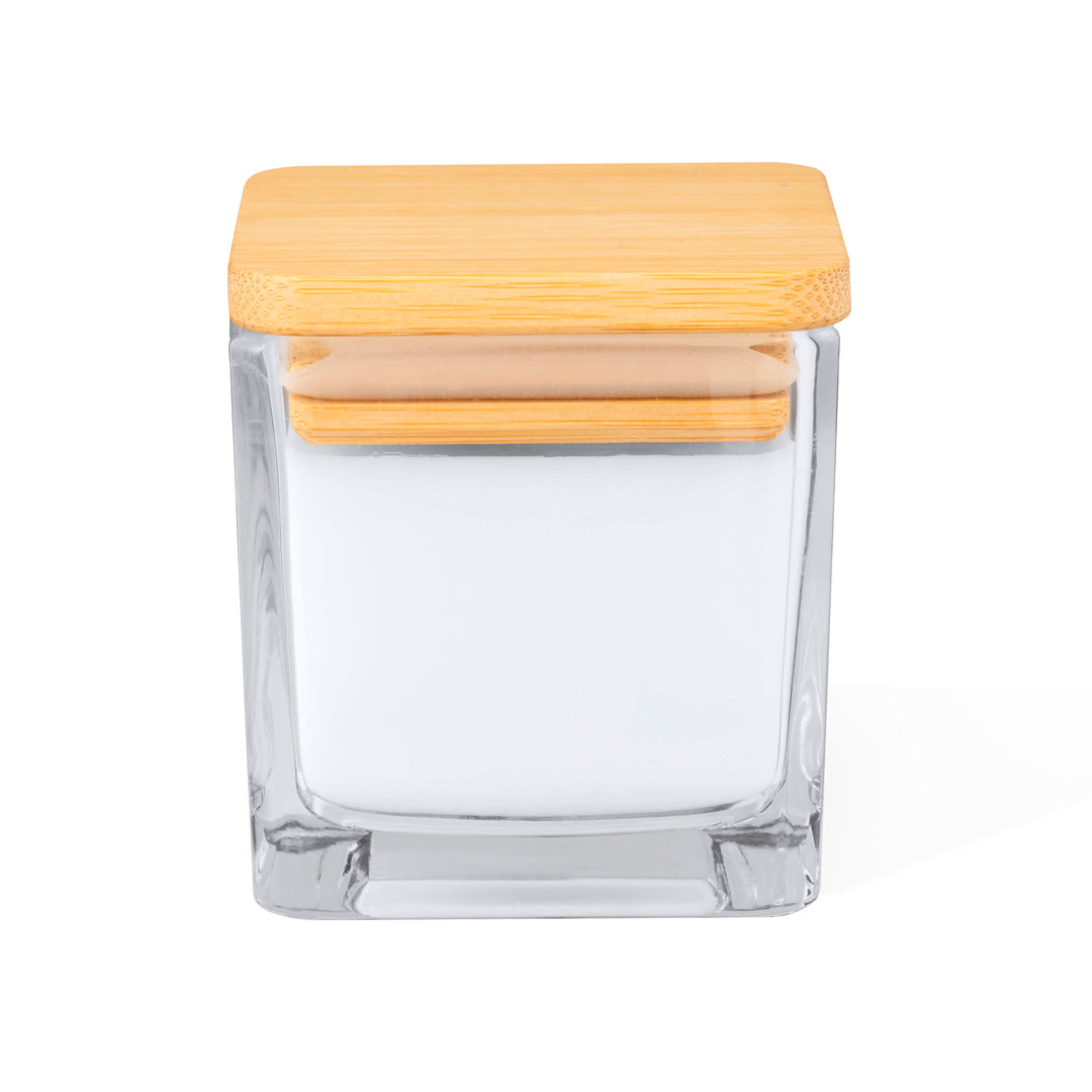 Vela aromática con perfume vainilla. Viene en tarro de cristal transparente, de forma cuadrada y con tapadera en bambú. Presentada en caja individual de diseño kraft. Materiales como el bambú fomentan la utilización de materias primas naturales, reduciendo las emisiones contaminantes. Proviene de una planta de gran resistencia y versatilidad, con crecimiento y regeneración rápidos, siendo una excelente alternativa al uso de madera tradicional.