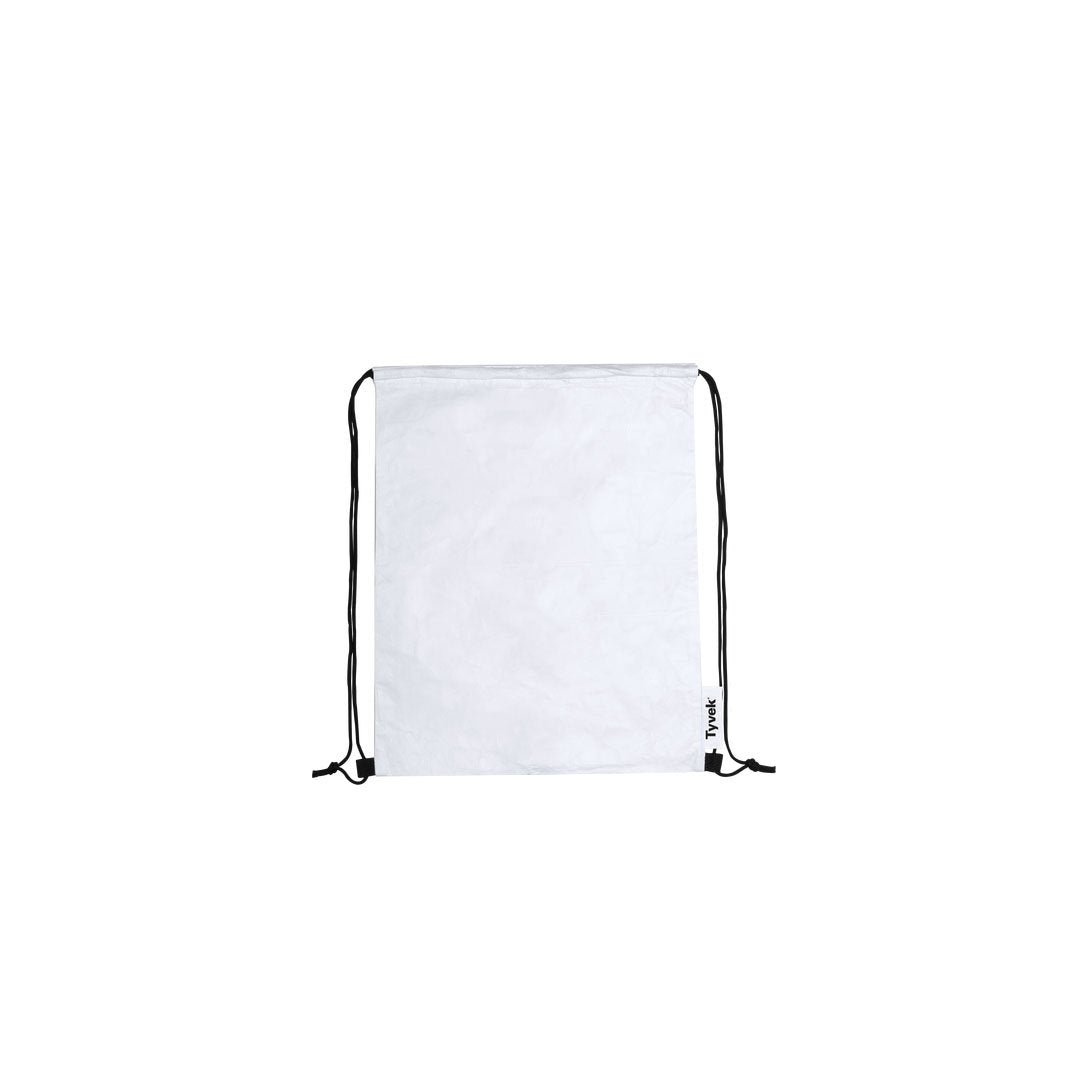 Mochila de cuerdas en suave y ligero material Tyvek, 100% reciclable y elaborado a partir de fibras de polietileno, que destaca especialmente por su resistencia, flexibilidad, durabilidad y facilidad para la impresión. Con cuerdas autocierre en color negro y esquinas reforzadas. Con distintivo Tyvek en etiqueta lateral.