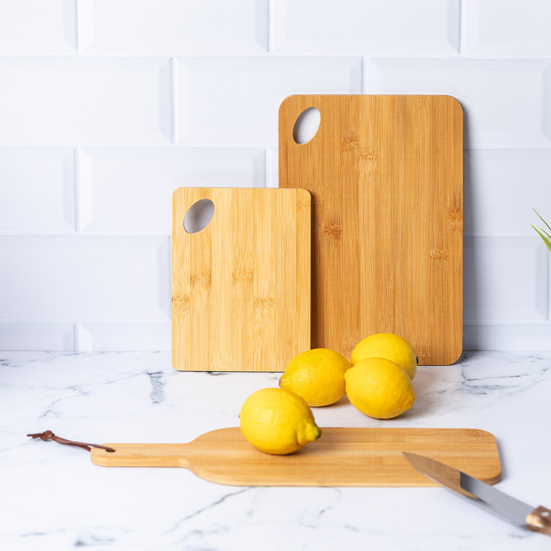Tabla fabricada en bambú, de suave y resistente acabado pulido. Ideal para corte y presentación. Con asa para fácil manejo y cordón para colgar en símil piel.