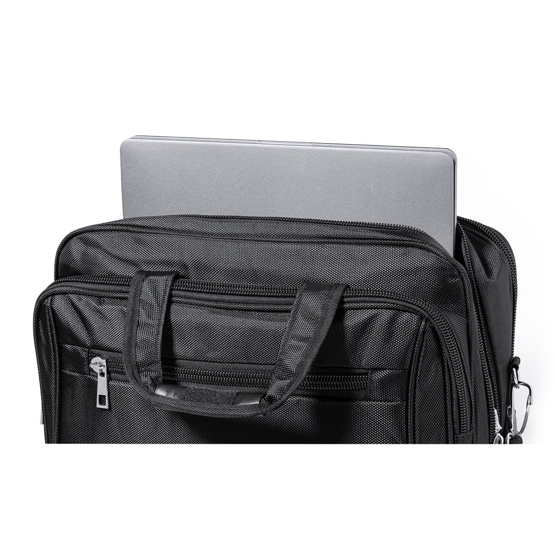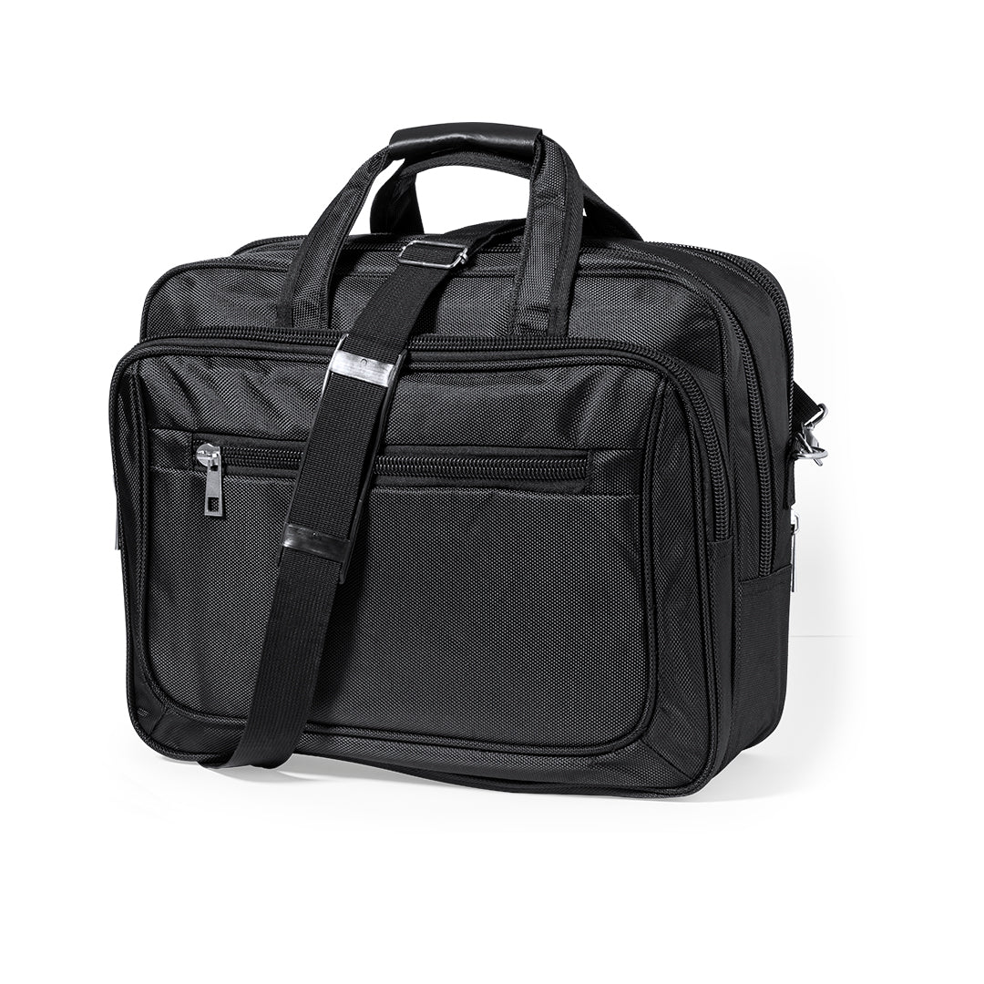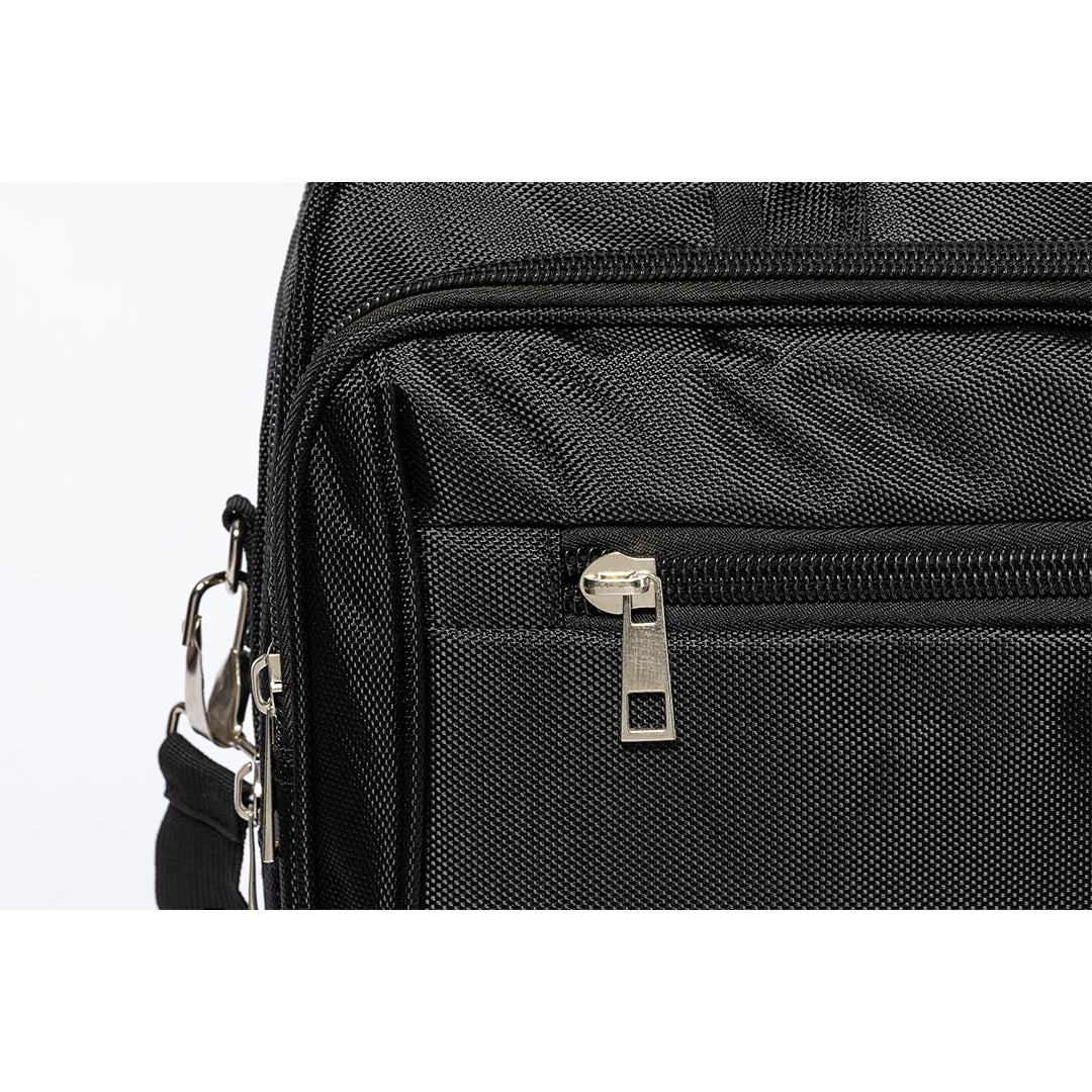 Maletín de alta calidad con cierre de cremallera a juego y en suave y resistente poliéster 1680D de elegantes acabado en color negro. Con 5 bolsillos exteriores con cierre de cremallera y tiradores de alta calidad, compartimento interior acolchado para portátil de hasta 14 pulgadas, cómodas asas de transporte reforzadas en polipiel, además de cinta bandolera ajustable, a juego, con refuerzo acolchado para hombro y cierres de mosquetón.