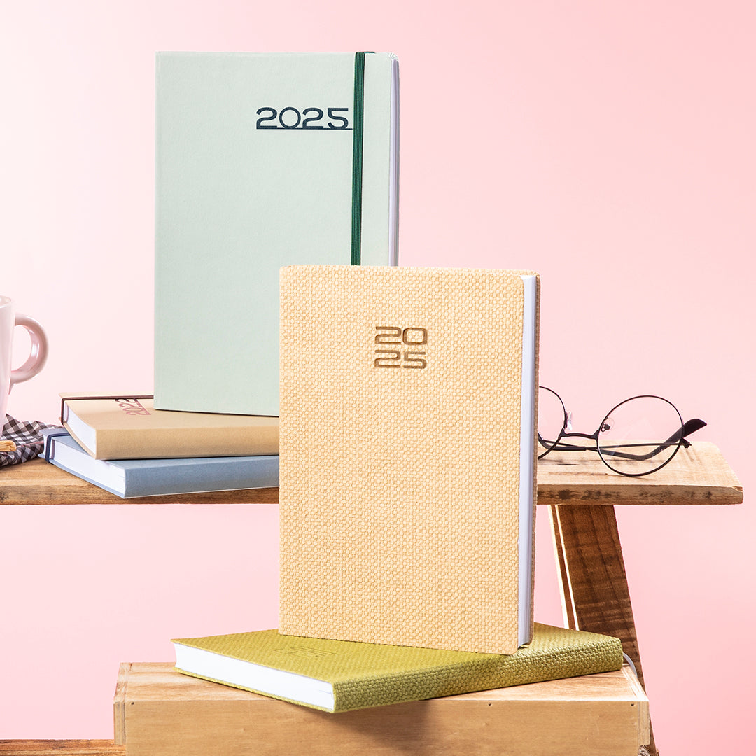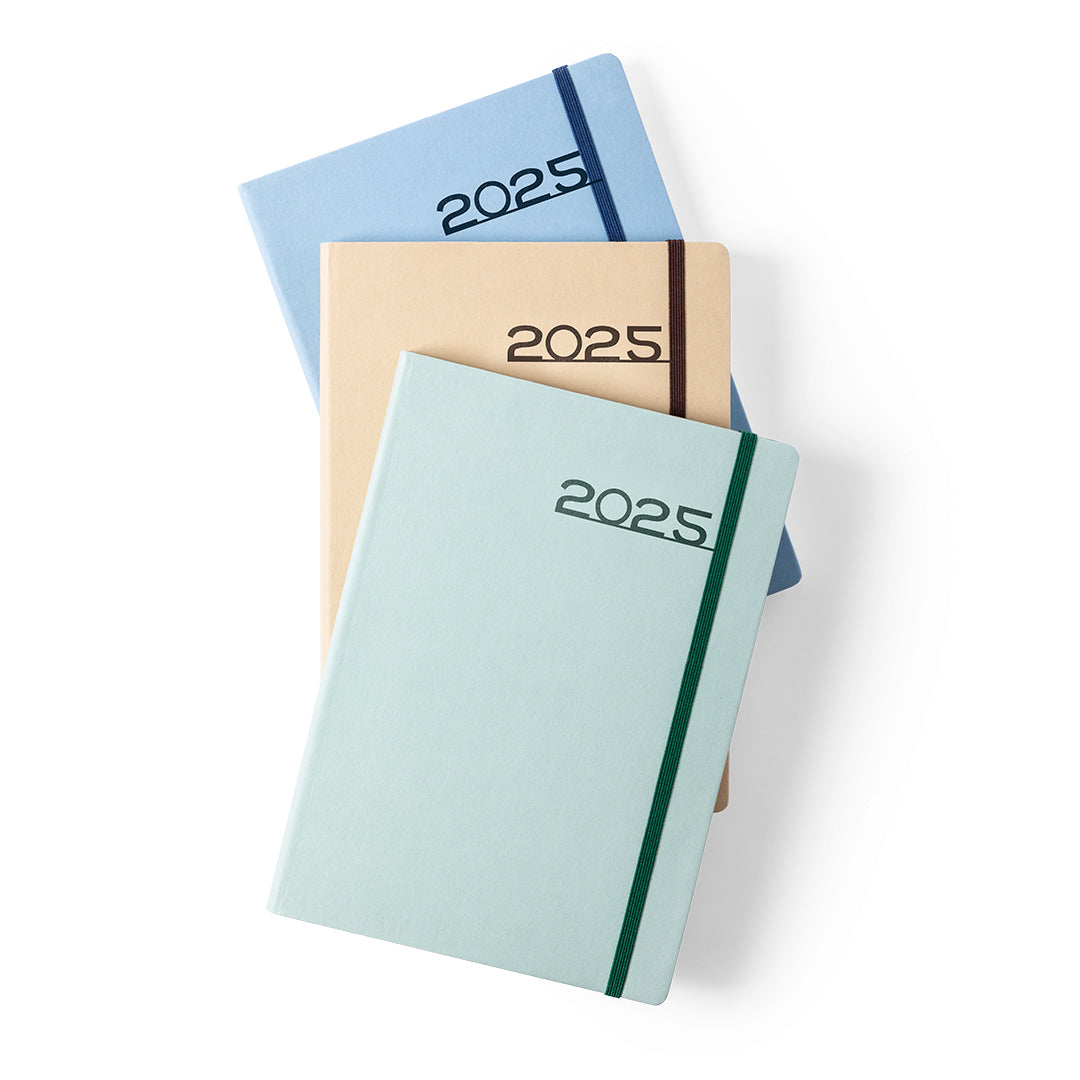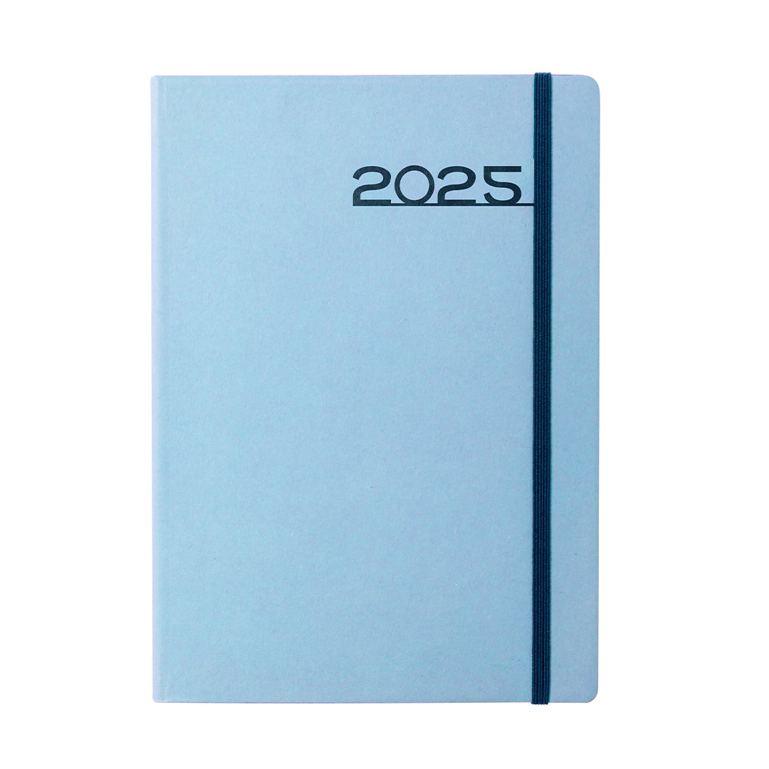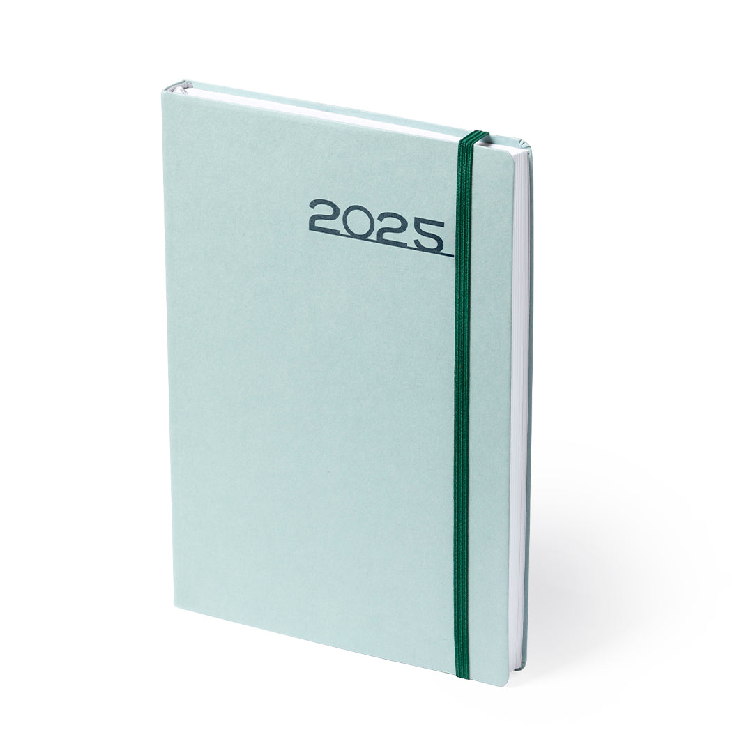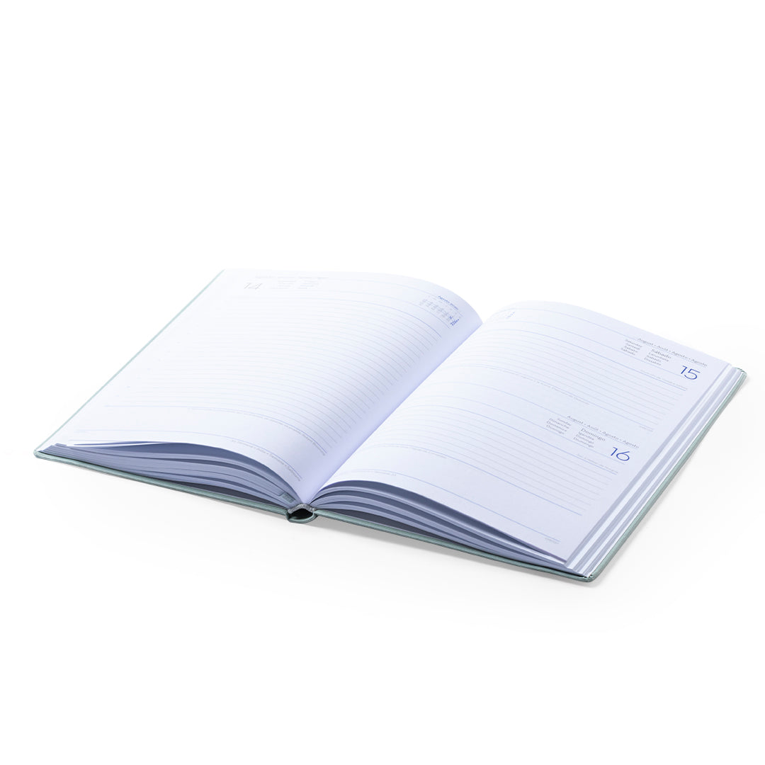 Agenda de tamaño A5 en resistente cartón. Con cubiertas rígidas, elástico de cierre y distintivo ecofriendly. Disponible en variada gama de colores. Diseño página día con frase del día. En 8 idiomas: castellano, inglés, francés, italiano, portugués, gallego, euskera y catalán. Con distintivo eco friendly en contraportada y fabricada con papel libre de cloro elemental (ECF), que reduce de manera drástica la contaminación en el proceso de blanqueado de la pulpa del papel, consiguiendo una excelente calidad en el acabado final y, al mismo tiempo, garantizando el proceso de reciclado en múltiples ocasiones.