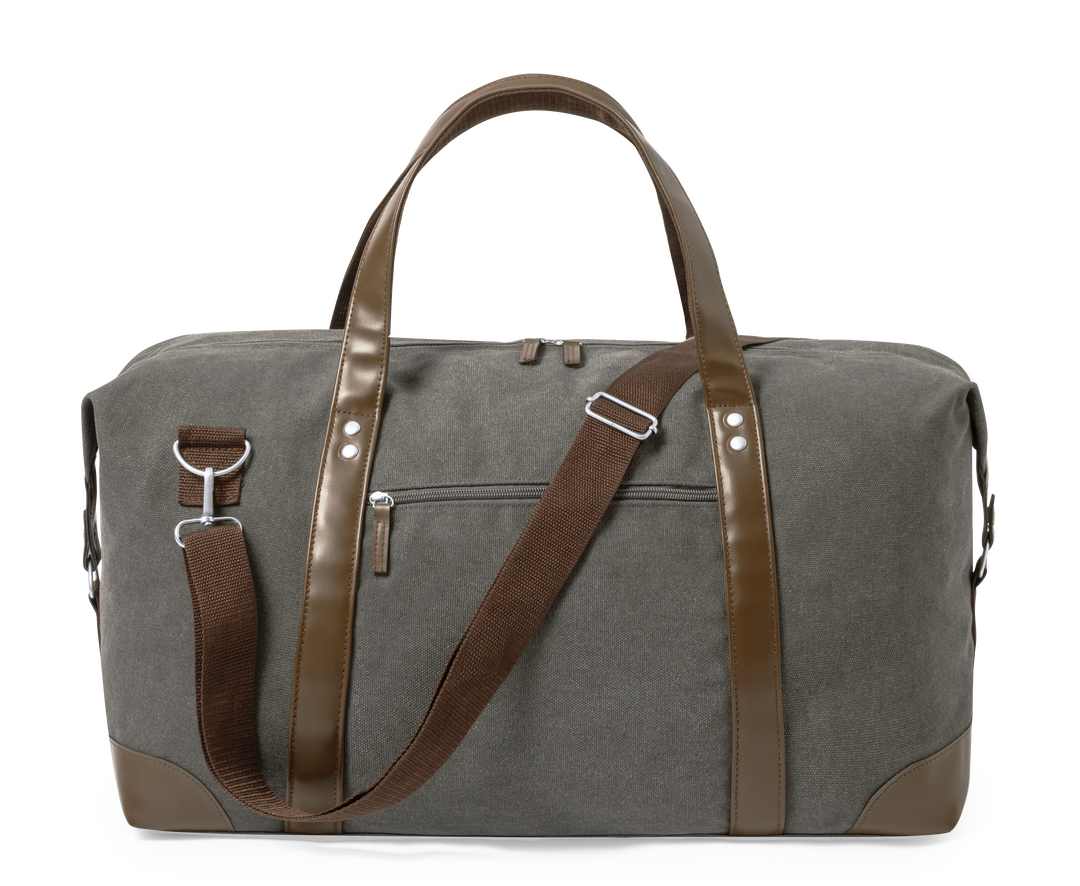 Elegante bolso fabricado en resistente canvas de 475g/m2 gris, con prácticas y resistentes asas en polipiel alrededor del bolso y esquinas reforzadas. Compartimento principal con cierre de cremallera a juego con las asas y cinta para hombro ajustable con mosquetón. Incluye bolsilo exterior de fácil acceso.Presentado en bolsa individual reciclada.