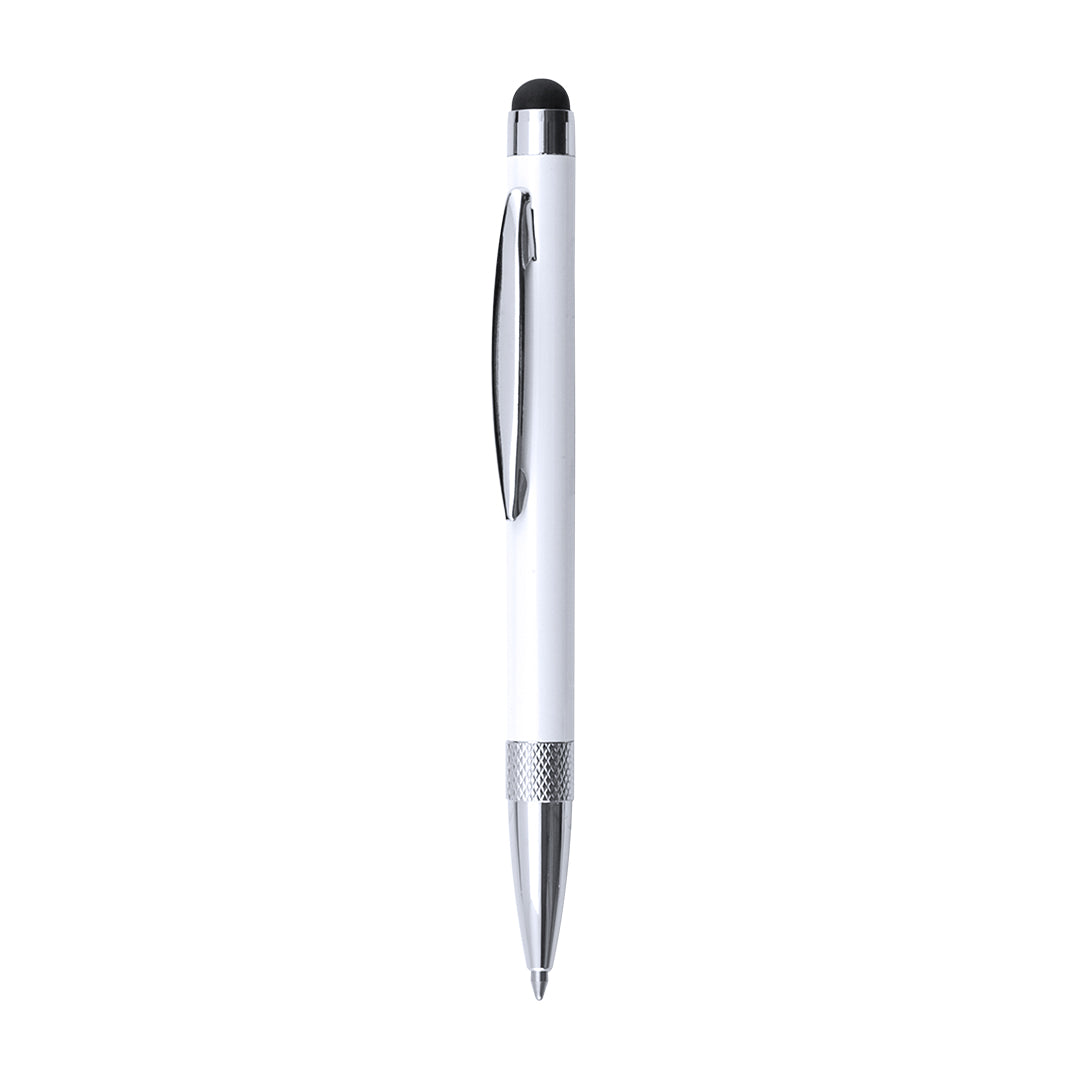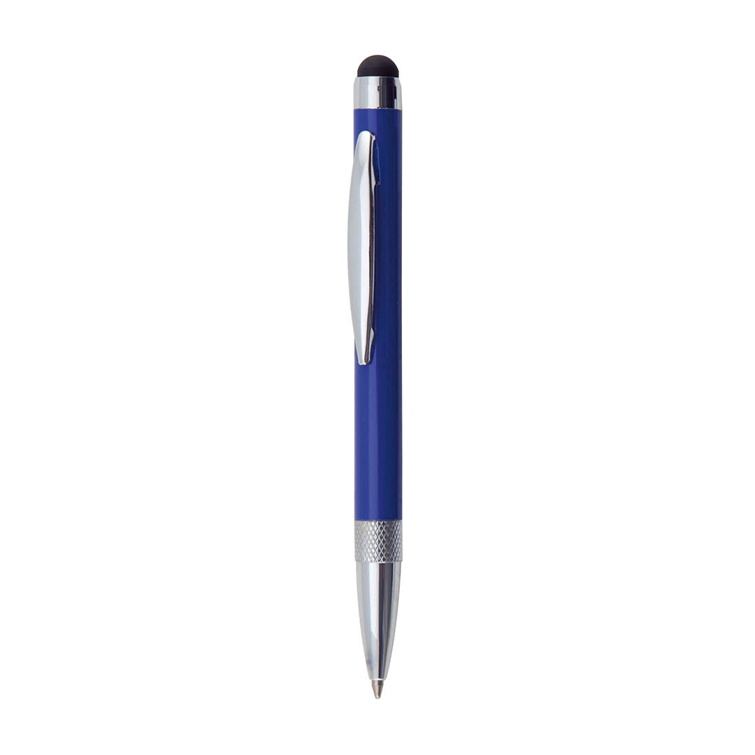 Bolígrafo puntero de mecanismo giratorio con cuerpo en aluminio de suave acabado metalizado en variados colores. Accesorios y anillas en color plateado. Tinta azul.