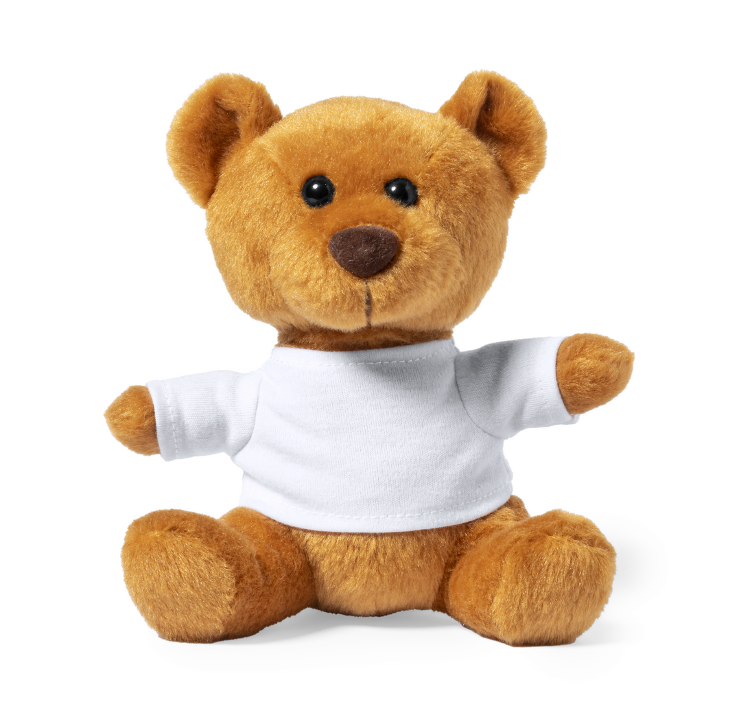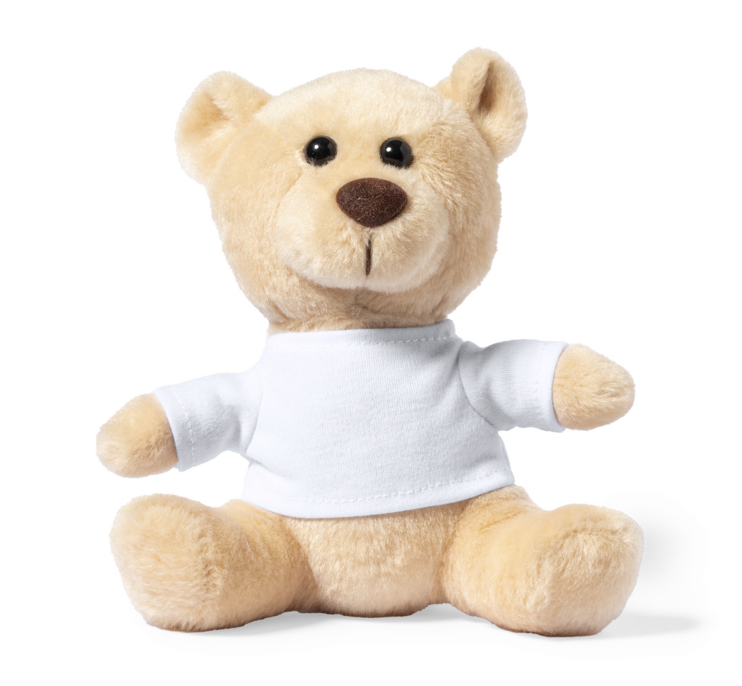 Tierno y suave osito de peluche, disponible en tonos natural y marrón. Con camiseta blanca extraíble para fácil marcaje.