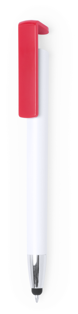 Original bolígrafo puntero de mecanismo pulsador con soporte integrado clip para dispositivo móvil. De atrevido diseño bicolor y con cuerpo en suave acabado de color blanco brillante. Clip en llamativos colores, punta en color plateado brillante y tinta azul.