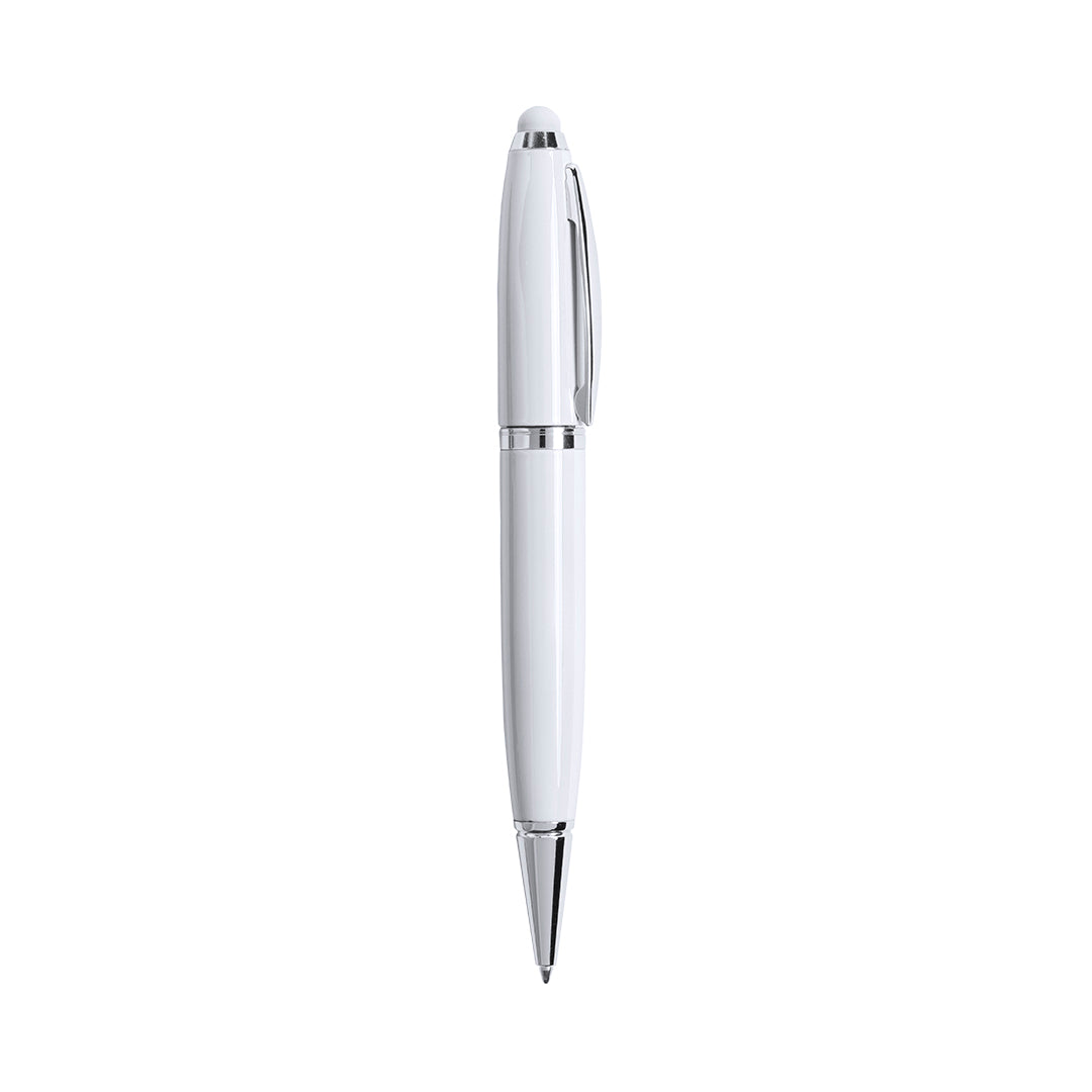 Bolígrafo tecnológico multifunción en sobrios colores, con memoria USB de 16GB de capacidad integrada en la capucha y puntero de suave goma a juego. Cuerpo en acabado métálico brillante, de apertura giratoria y con tinta azul. Presentado en elegante caja de cartón de color blanco con cierre magnético y suave espuma troquelada.