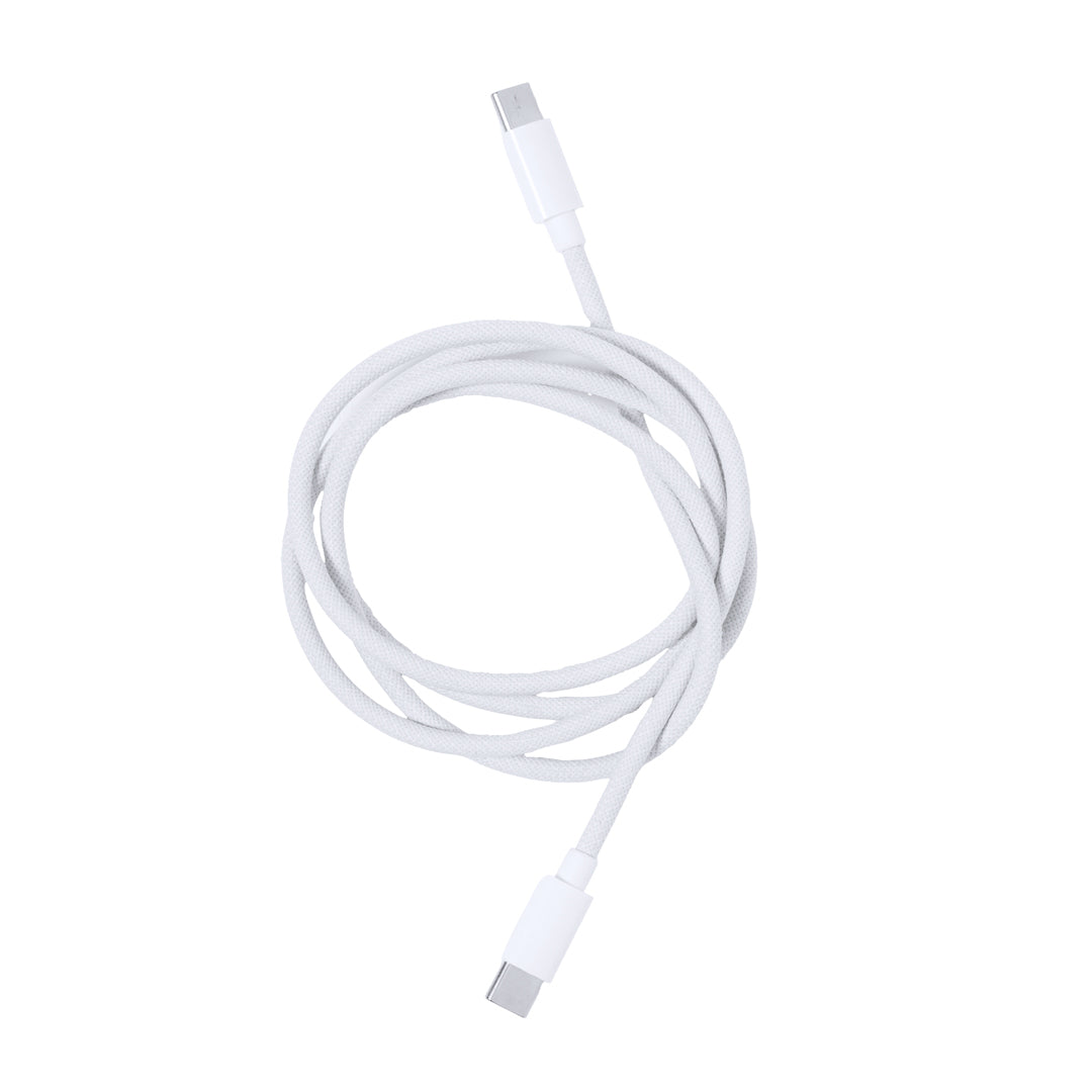 Cable cargador con conexión dual Tipo C. De 65W de potencia y apto para transferir datos. 100cm de longitud, con conectores de aluminio y presentado en atractivo estuche con una parte transparente y otra opaca. Con asa de transporte y presentado individualmente en bolsa reciclada.