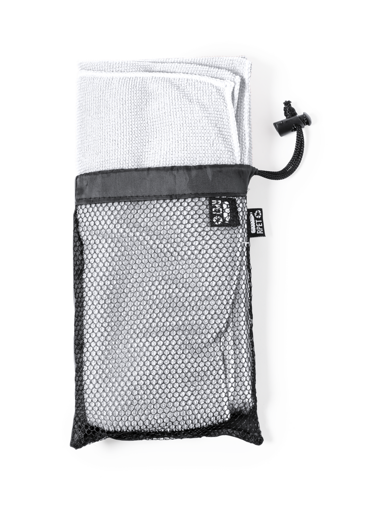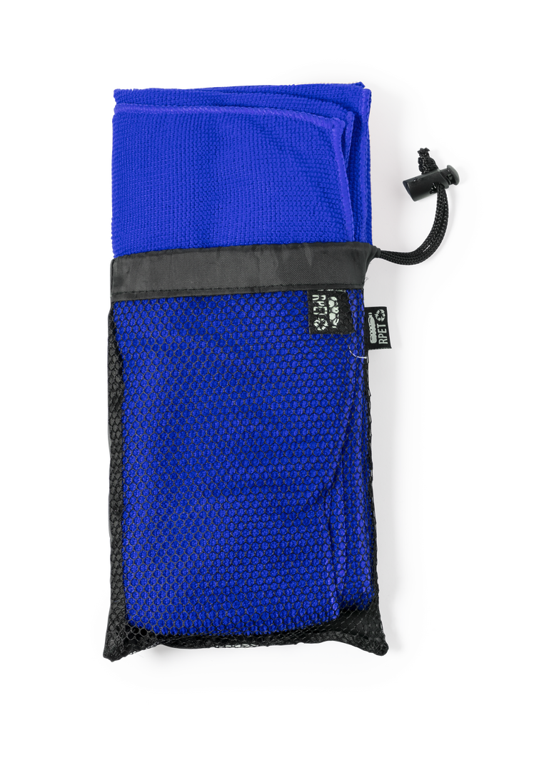 Toalla absorbente de línea nature. Fabricada en RPET de 160g/m2, elaborado a partir de plástico reciclado para así fomentar la reutilización de residuos plásticos y contribuir a la sostenibilidad del planeta. Tamaño 50x100 cm, presentada en funda individual de redecilla RPET con parte trasera lisa y disponible en variada gama de colores. Con distintivo RPET en etiqueta.
