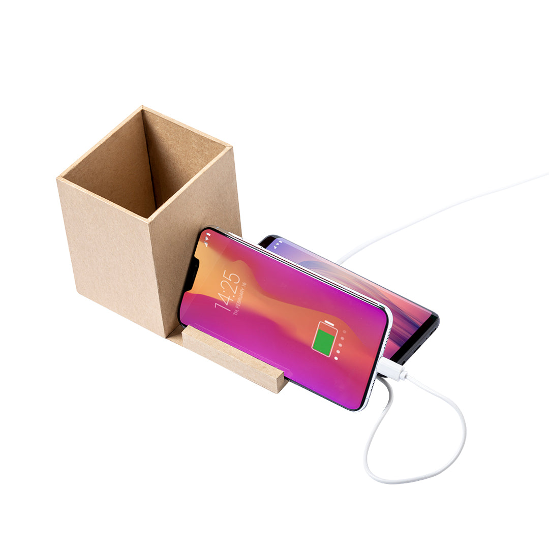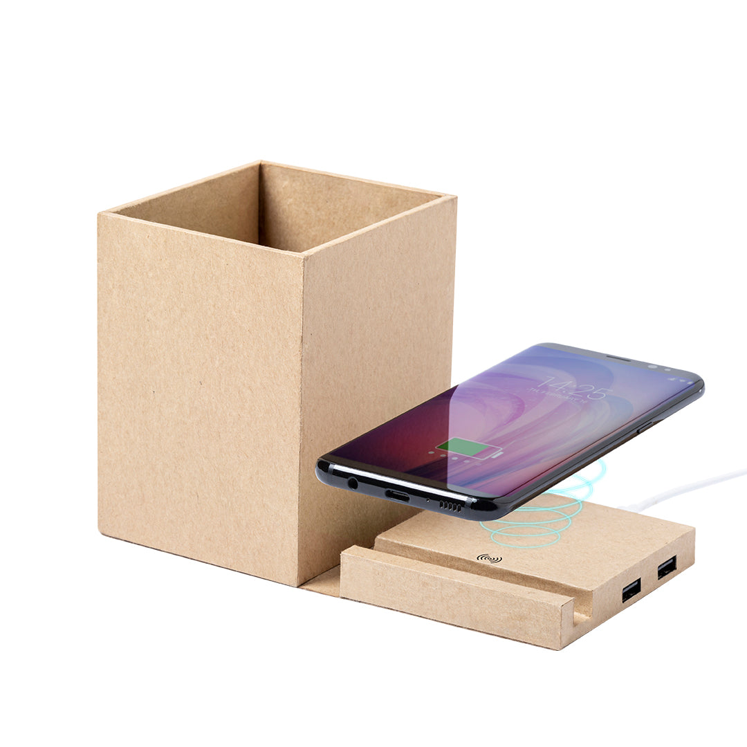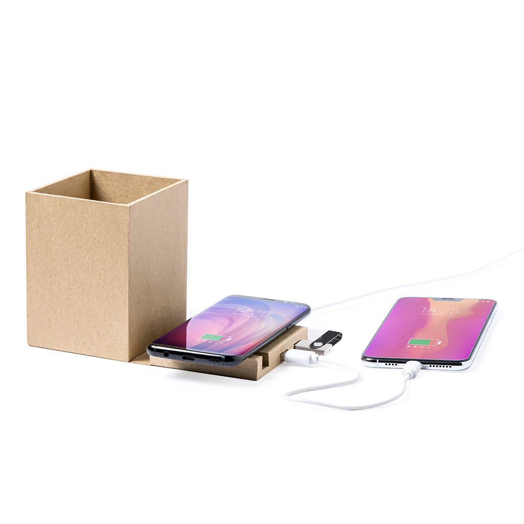 Lapicero multifunción 4 en 1 de línea nature fabricado en cartón reciclado, contribuyendo a la conservación de los bosques y reduciendo considerablemente la huella de carbono. Con funciones lapicero, soporte para smartphone, cargador inalámbrico y puerto USB (2xUSB 2.0). Diseño plegable con ajuste magnético. Compatible con smartphones con tecnología de carga inalámbrica. Incluye cable micro USB en color blanco de 1 metro de largo. Presentado en atractiva caja de diseño eco, con manual de instrucciones en español e inglés.