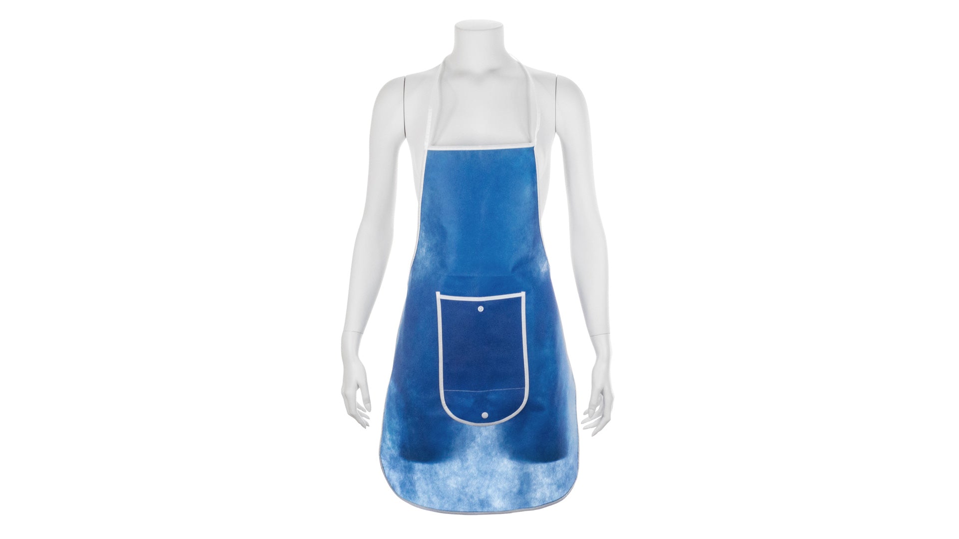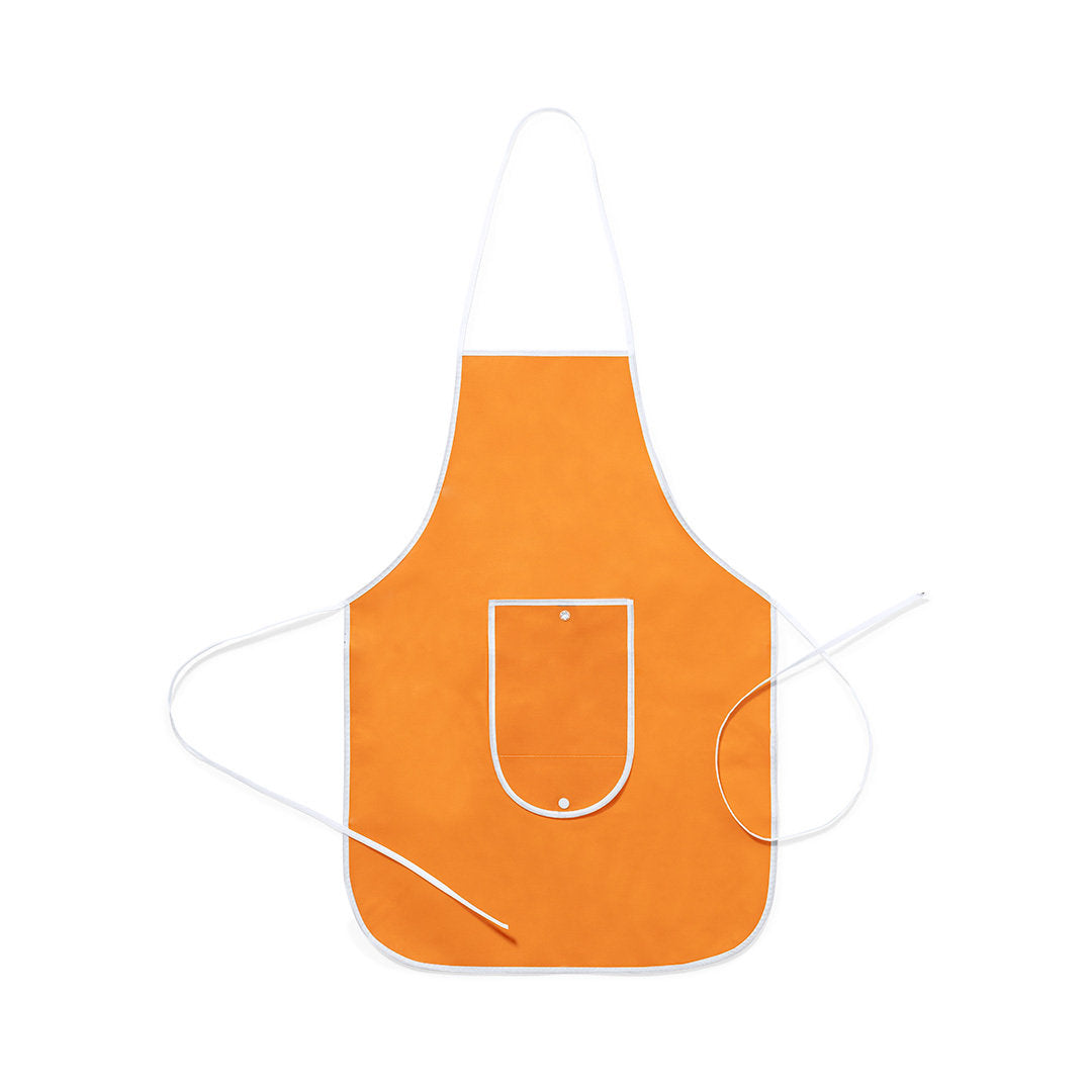 Delantal plegable de non-woven en variada gama de vivos colores. Con bolsillo frontal, cintas de ajuste y ribetes en color blanco. Plegado de pequeño tamaño con cierre de corchete y de corte por encima de la rodilla.