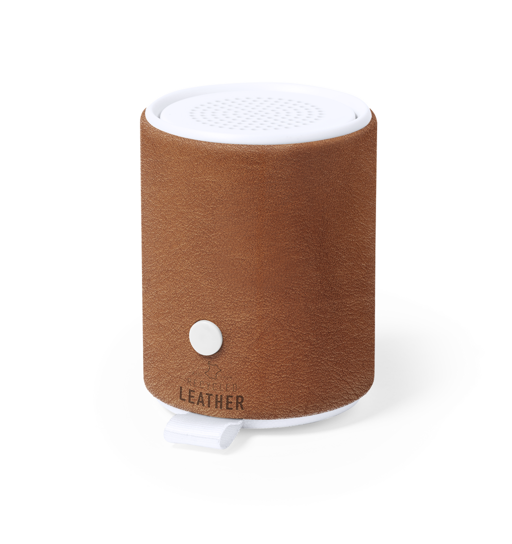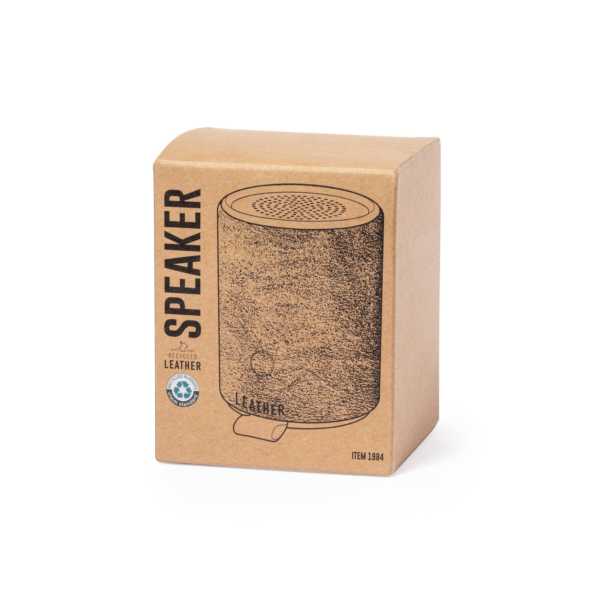 Altavoz Bluetooth con carcasa fabricada en RABS y forrada en cuero reciclado.Con 3W de potencia y batería de 400 mAh. Conexión Bluetooth 5.0, con ranura para tarjeta micro SD y base antideslizante. Incluye cable cargador Tipo C y manual de instrucciones en español e inglés. Presentado en caja individual de diseño kraft.El material RABS o ABS Reciclado y el cuero reciclado proceden del reciclado de artículos al final de su vida útil. Los materiales reciclados empleados incorporan la certificación RCS, que garantiza el origen reciclado de los mismos.