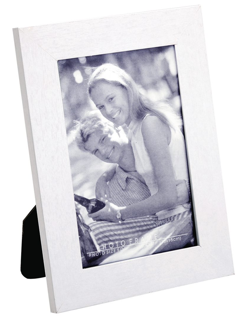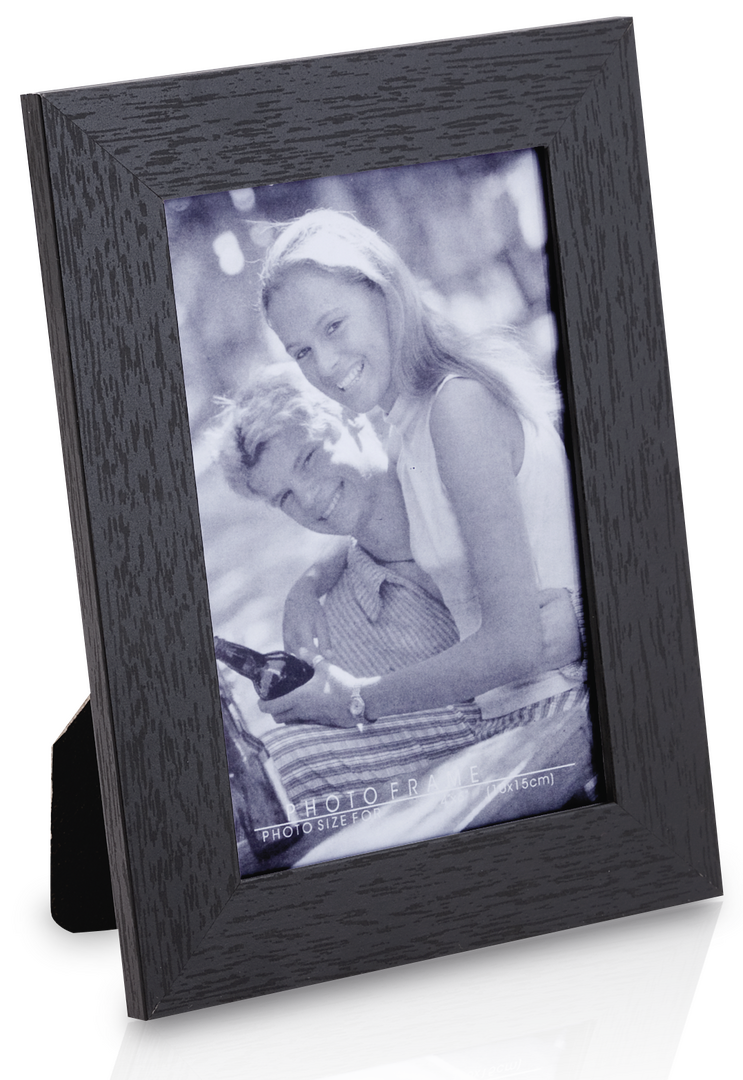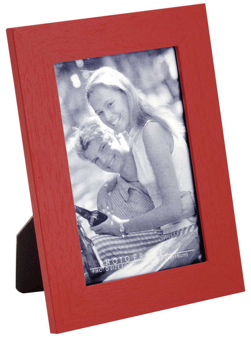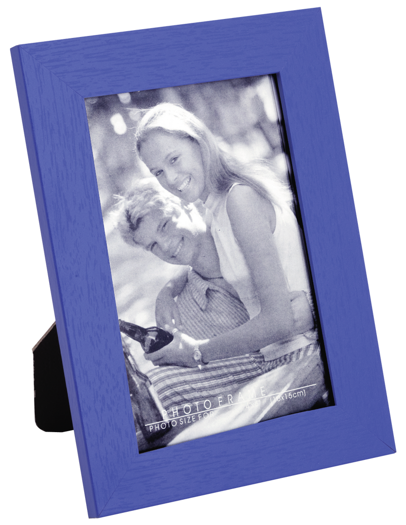 Portafotos en variada gama de colores con marco de madera. Con cristal protector y soporte antideslizante para posicionado horizontal y vertical. Para fotos de hasta 10x15cm y presentado en caja individual.