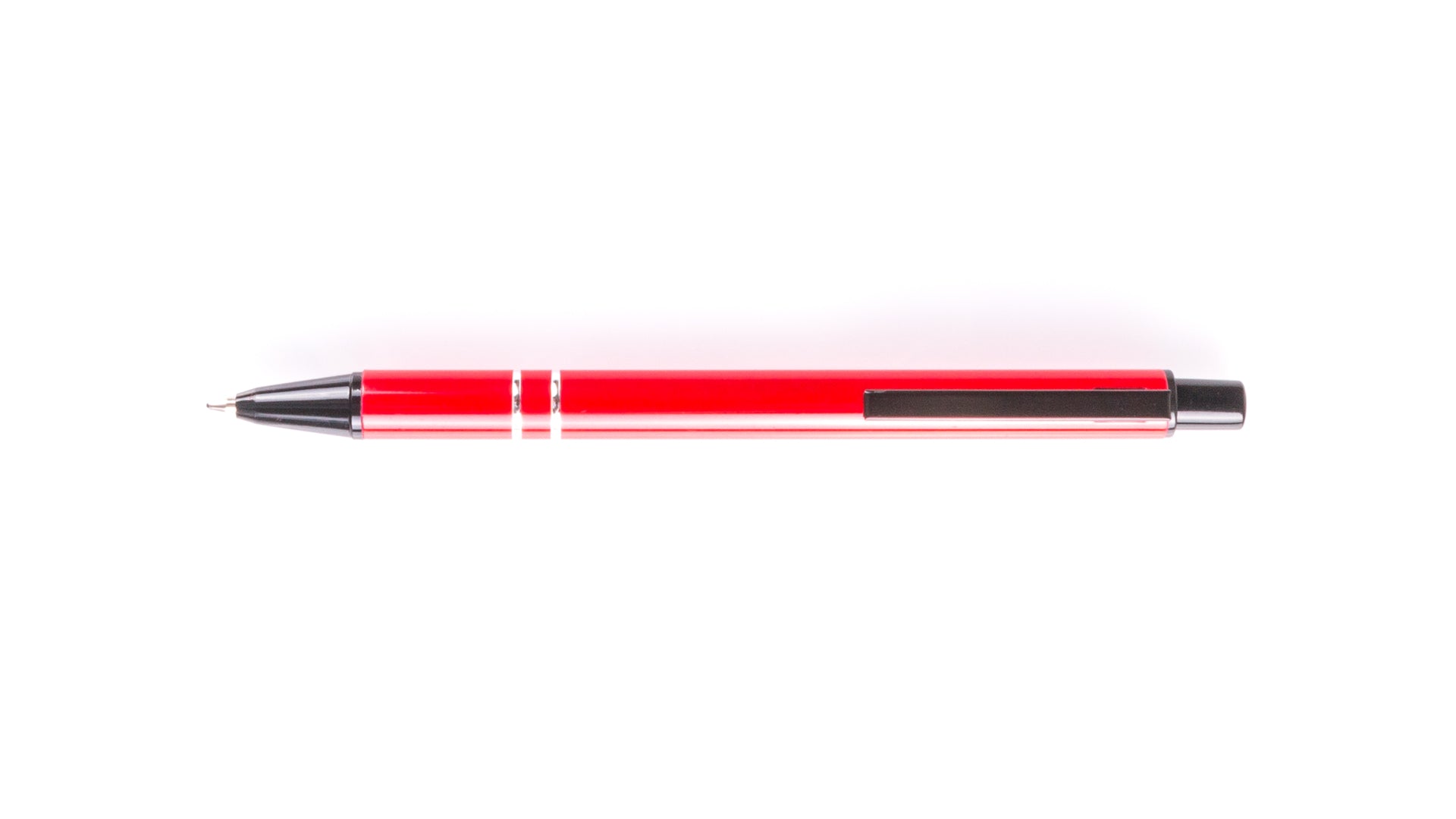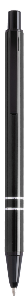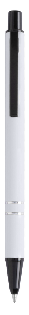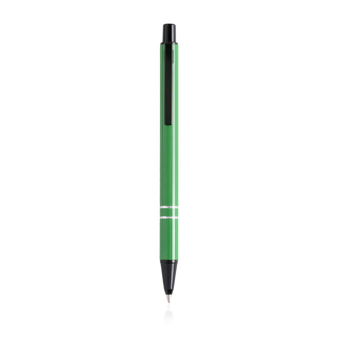 Bolígrafo de mecanismo pulsador en original diseño bicolor. Con cuerpo en aluminio de suave acabado en alegres colores. Accesorios en color negro y anillas en plateado. Tinta azul.