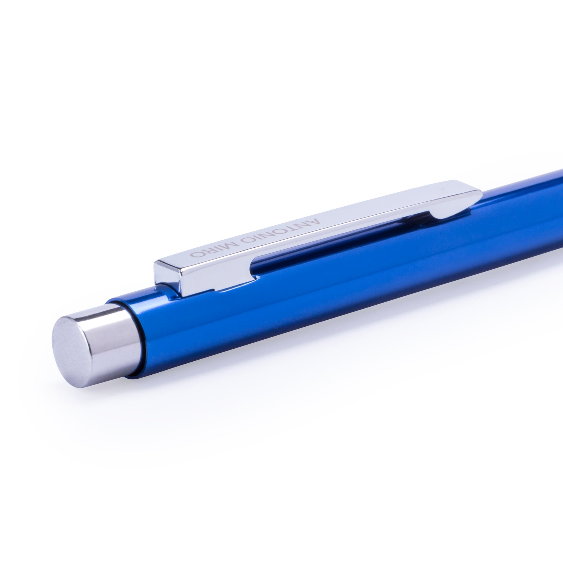 Bolígrafo de Antonio Miró con cuerpo en aluminio de variada gama de vivos colores y en color plateado. De mecanismo pulsador y presentado en bolsita don logotipo de la marca. Tinta azul.