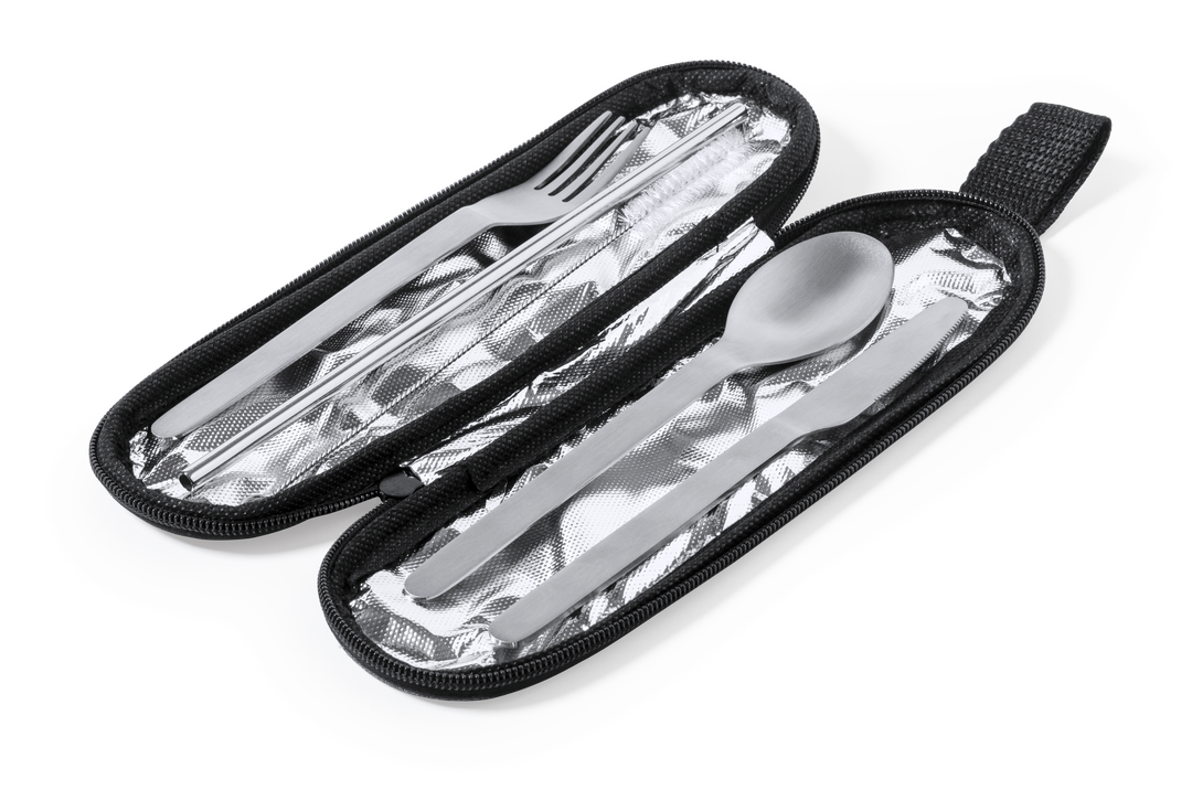 Set de cubiertos reutilizables fabricados en resistente y duradero acero inox. Incluye cuchara, cuchillo, tenedor, pajita y accesorio de limpieza. Presentados en elegante estuche individual de poliéster 300D RPET, elaborado a partir de plástico reciclado para así fomentar la reutilización de residuos plásticos y ayudar a la sostenibilidad del planeta. Estuche con cinta de transporte, cierre de cremallera y distintivo RPET en etiqueta.