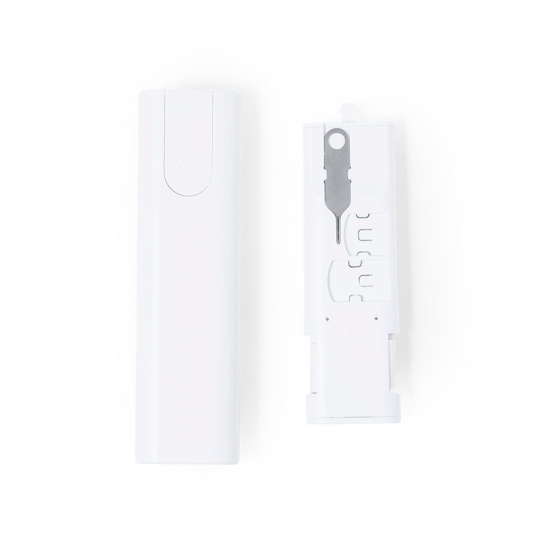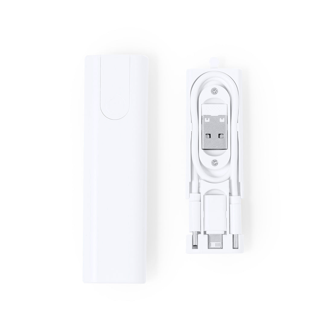 Completo set de cables cargadores fabricados en resistente ABS. Presentados en un compacto estuche fabricado en resistente ABS de color blanco, con soporte para smartphone integrado. Incluye cable cargador y sincronizador, apto para transferencia de datos y múltiples conexiones: Micro USB, Tipo C y Lightning; eyector de SIM incluido. 5V DC 3A. Presentado en caja de diseño kraft.