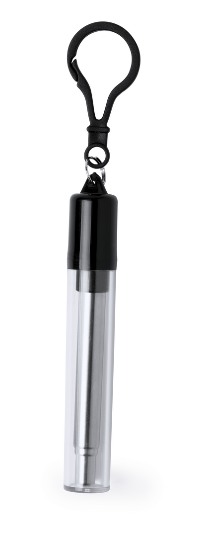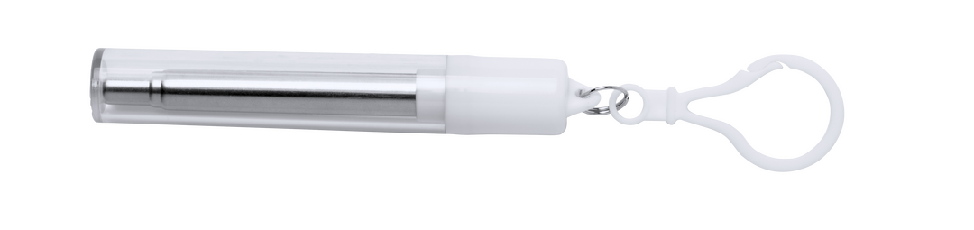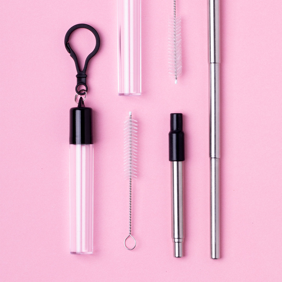 Pajita reutilizable y extensible en acero inoxidable, con boquilla de silicona. Con accesorio limpiador incluido y presentada en estuche transparente con accesorio para transporte.