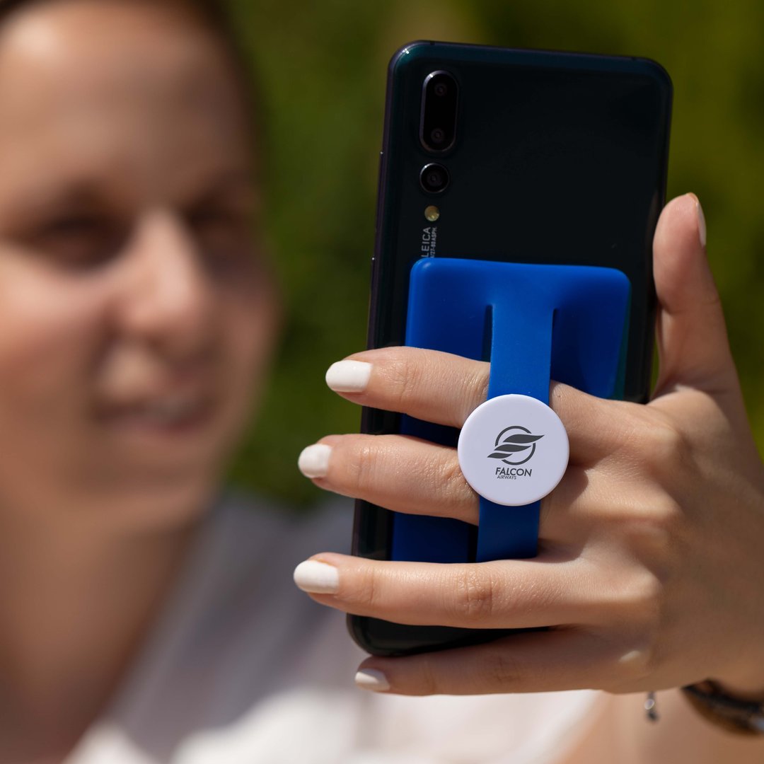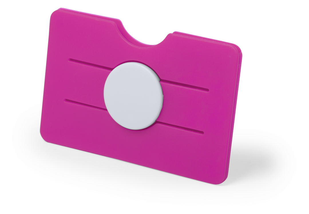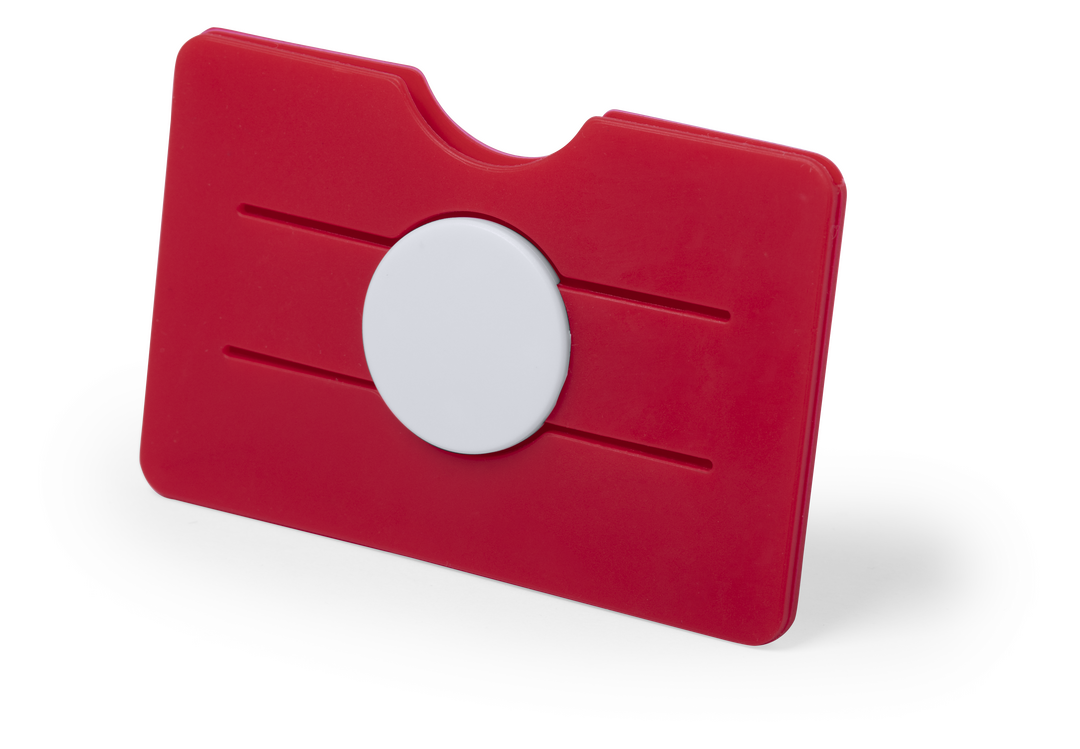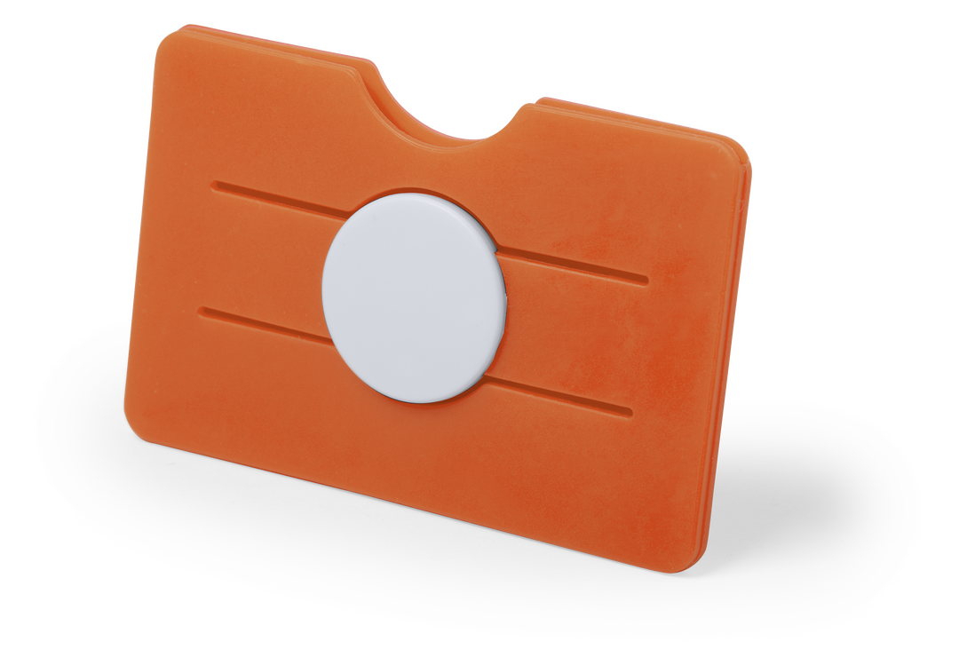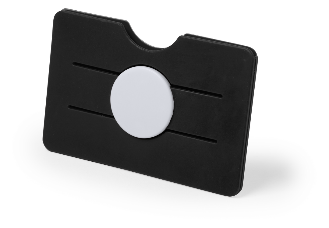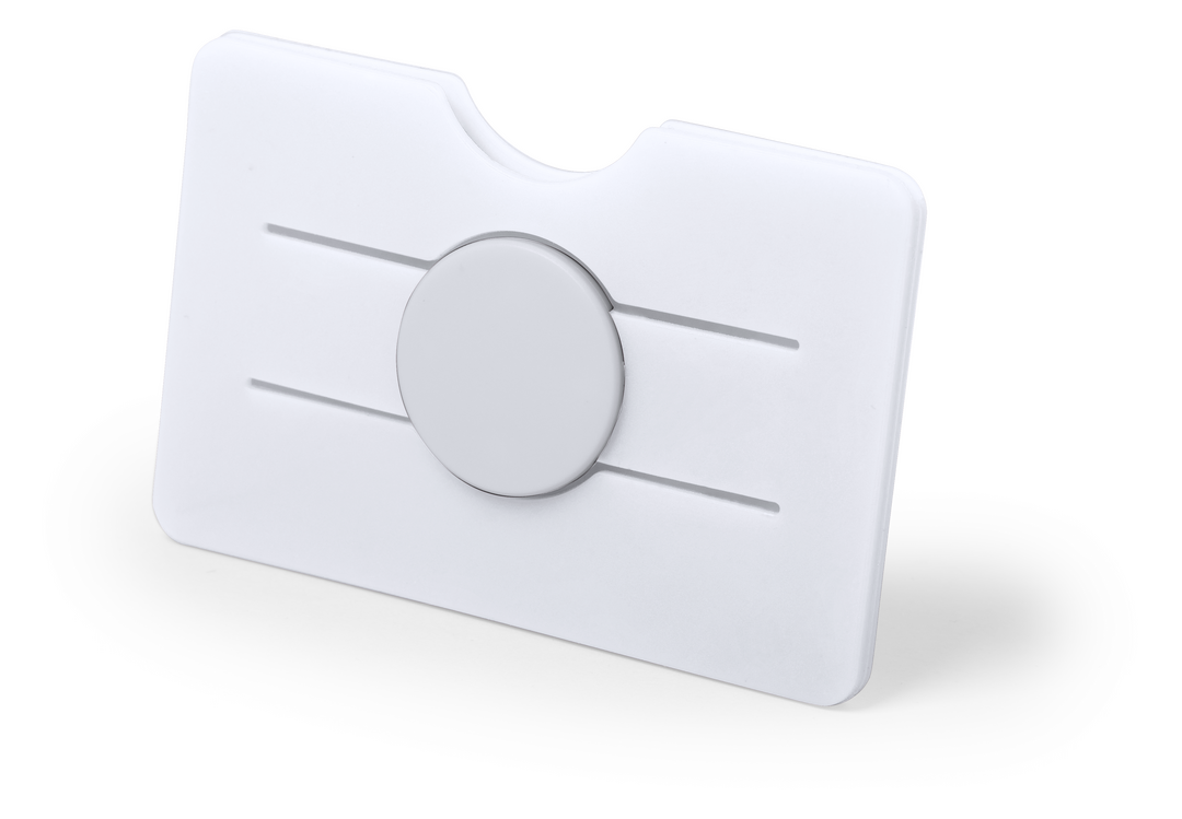 Tarjetero con sporte para smartphone. En materiales ABS y silicona, con adhesivo 3M, de fijación extra fuerte y libre de residuos al despegarlo del dispositivo. Tarjetero con capacidad para 4-5 tarjetas y disponible en llamativos colores, con soporte para los dedos en color blanco.