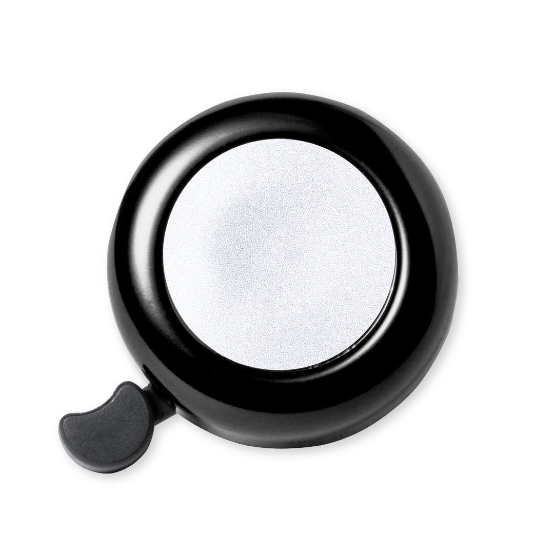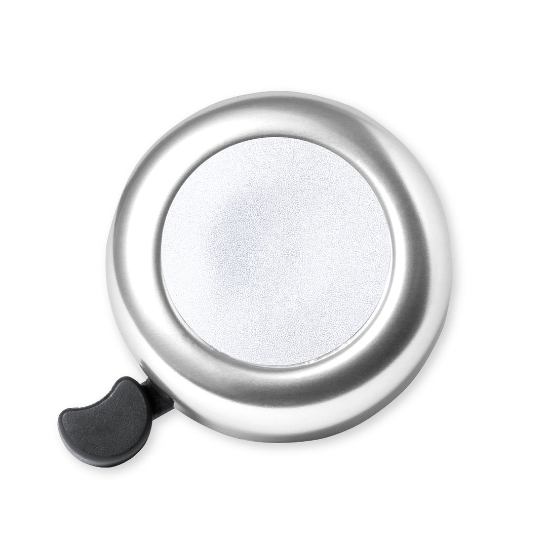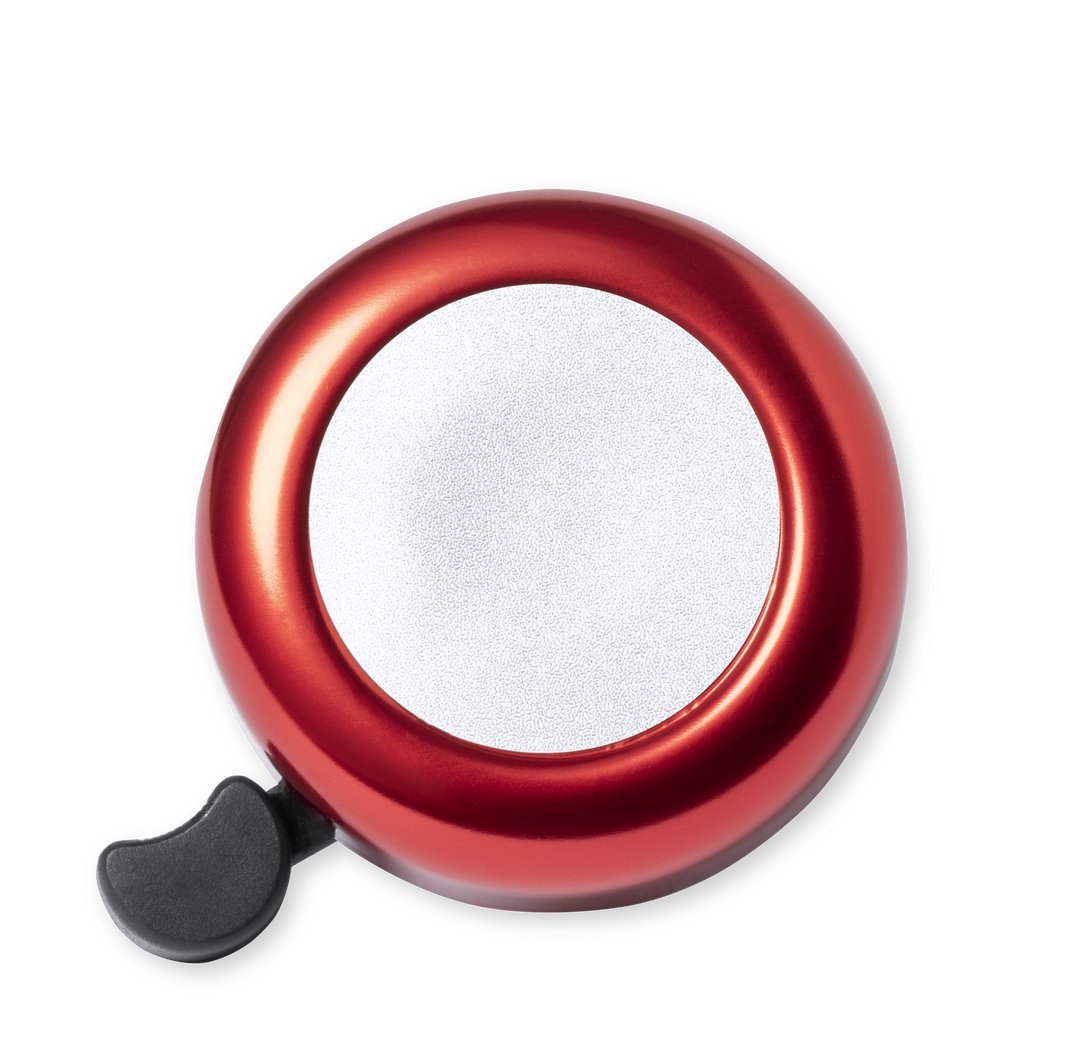 Timbre para bicicleta fabricado en resistente aluminio de acabado brillo. Con ajuste de seguridad para manillar y disponible en variada gama de colores.