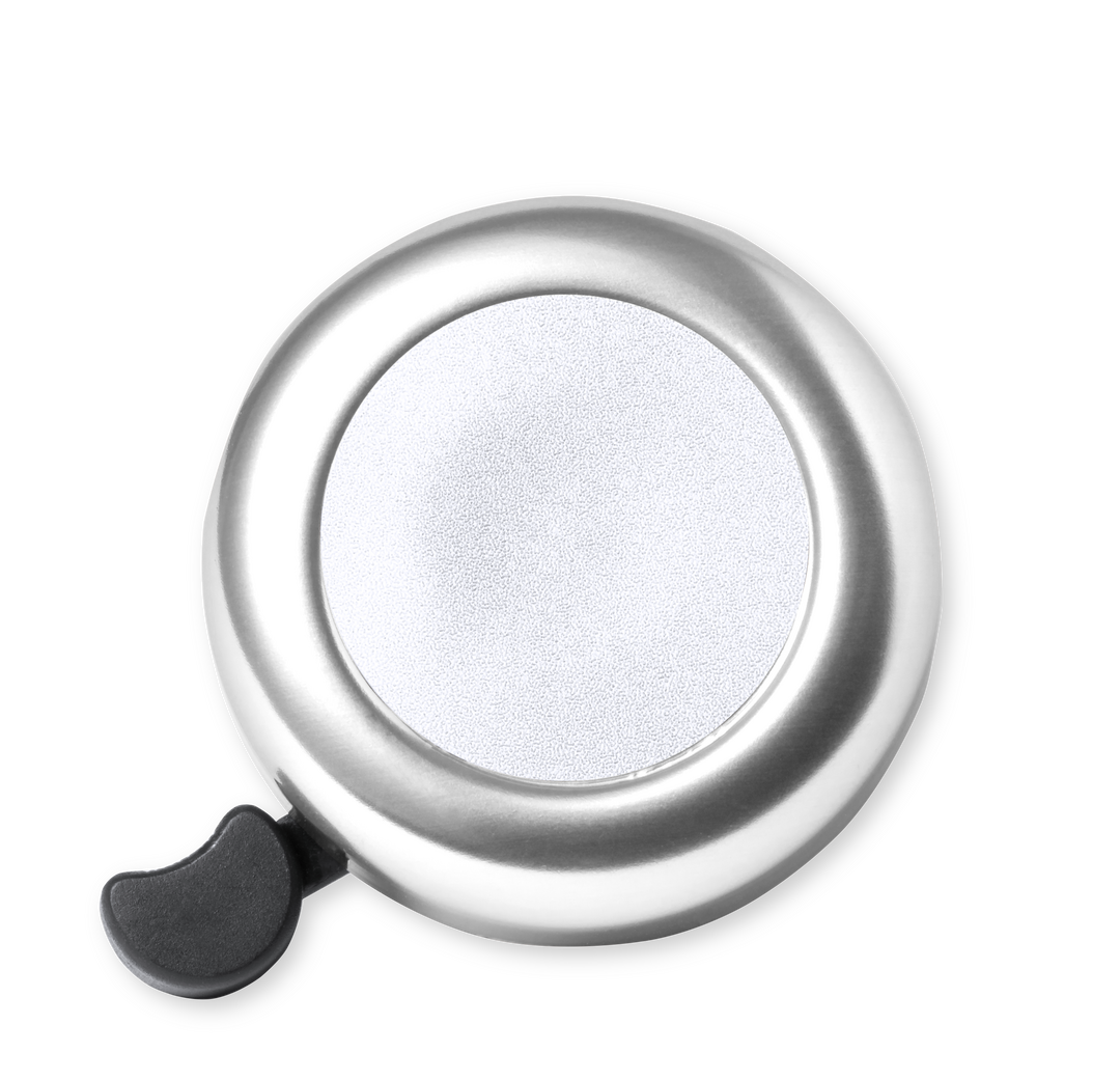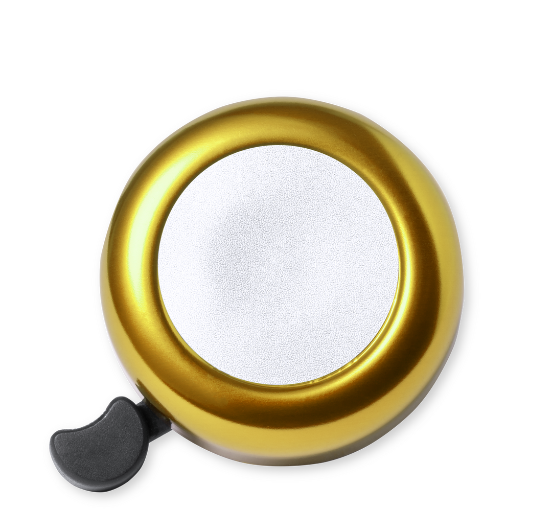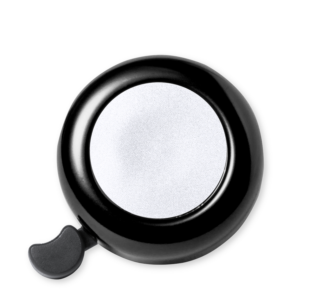 Timbre para bicicleta fabricado en resistente aluminio de acabado brillo. Con ajuste de seguridad para manillar y disponible en variada gama de colores.