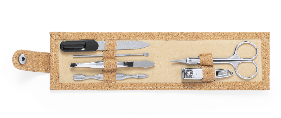 Set de manicura de línea nature con funda fabricada en corcho, para así fomentar la utilización de materias primas naturales y reducir las emisiones contaminantes. Incluye 6 accesorios de acero inox: tijeras, pinzas, cortaúñas, lima y 2 quitacutículas. Soportes interiores para accesorios y cierre de corchete. Totalmente desplegable para fácil marcaje.