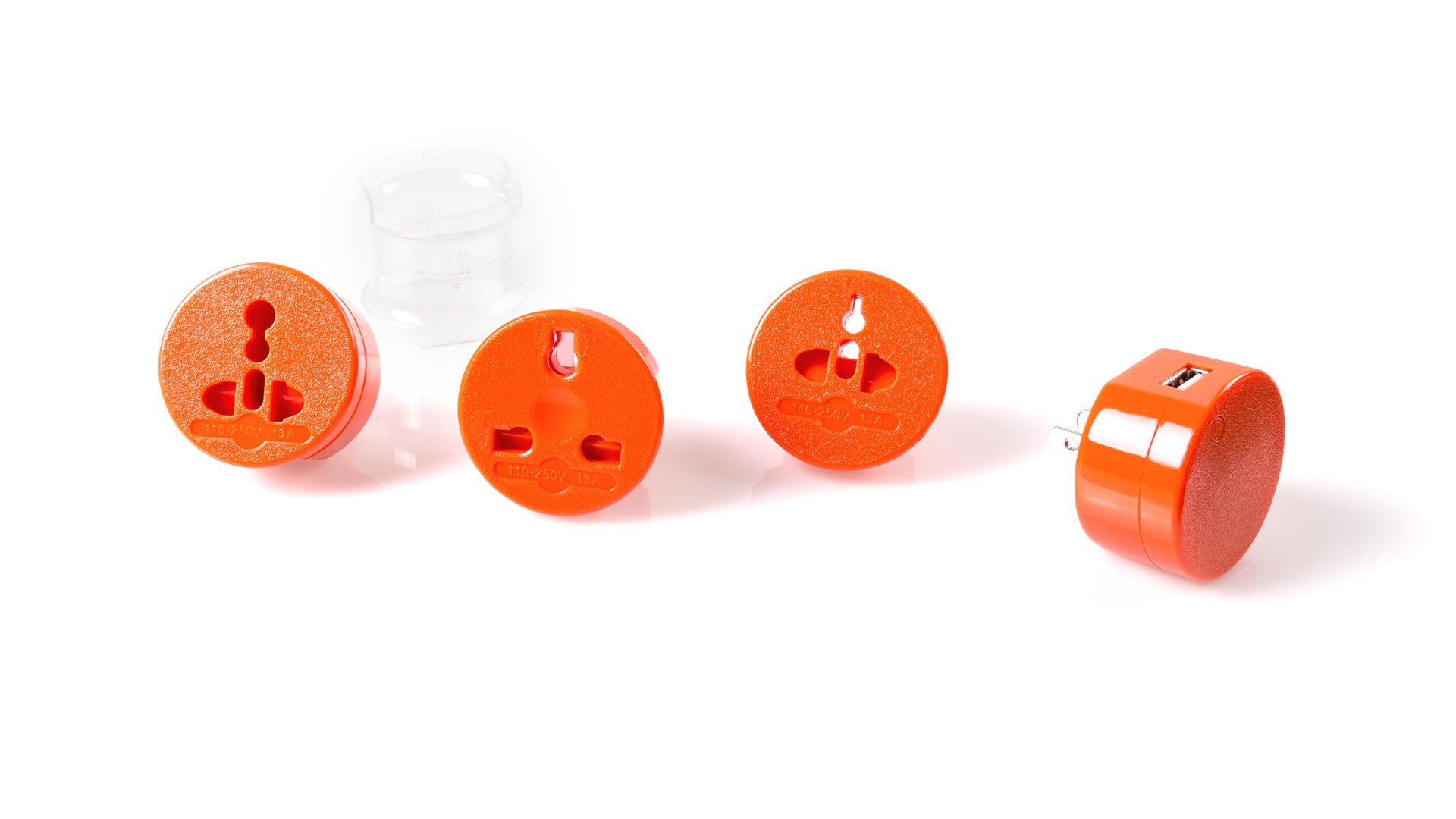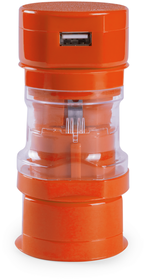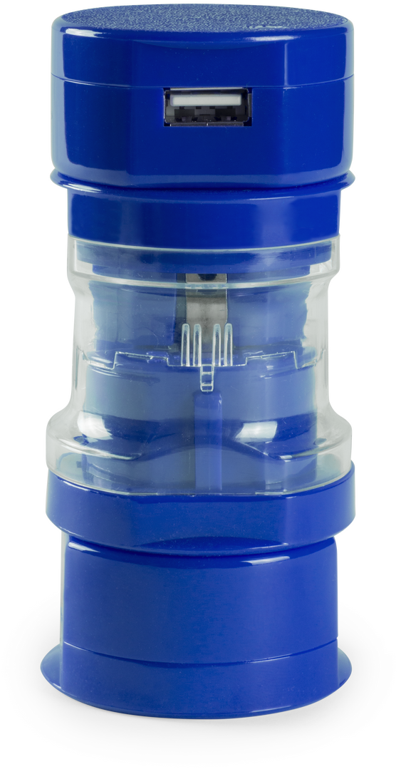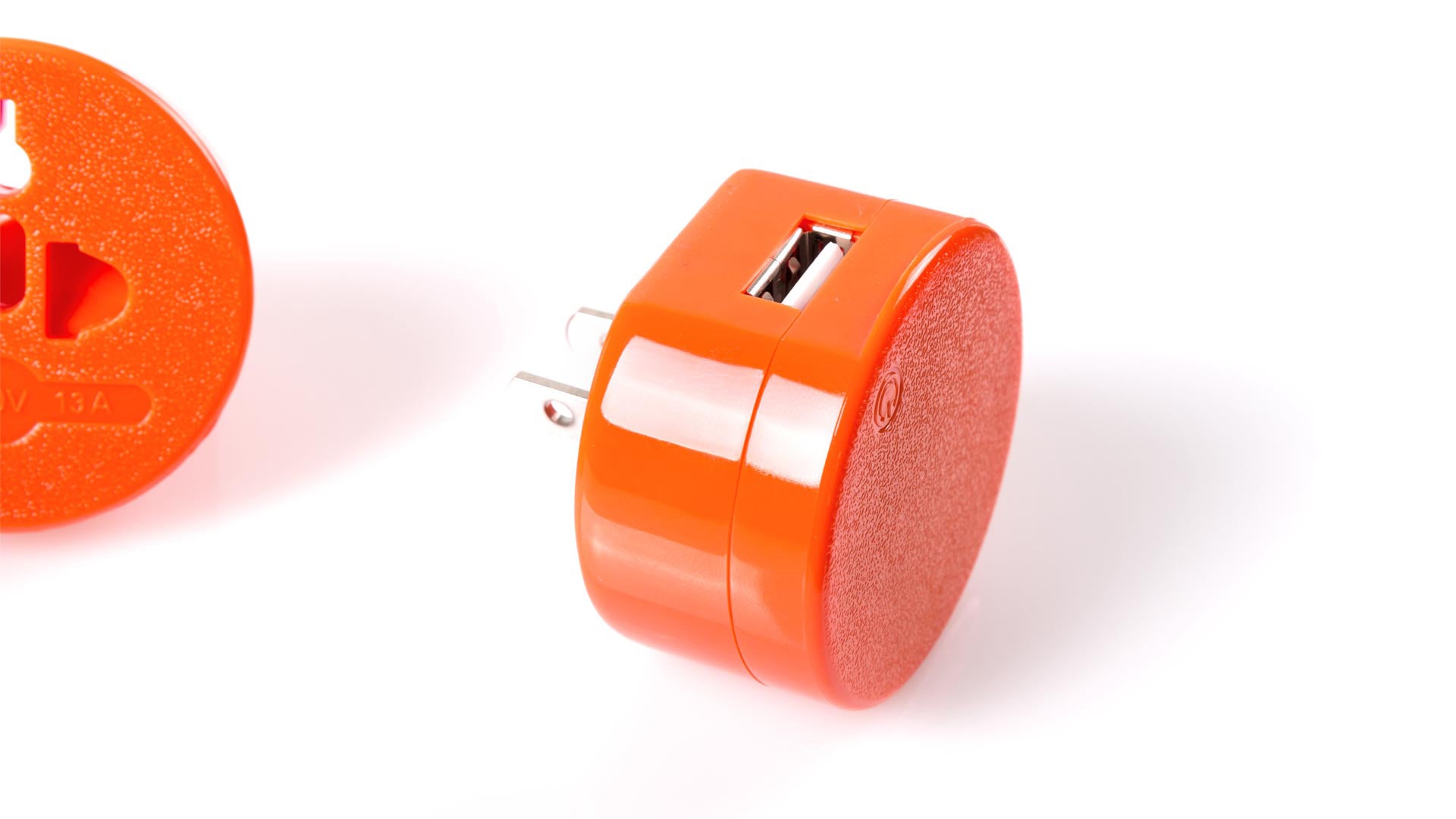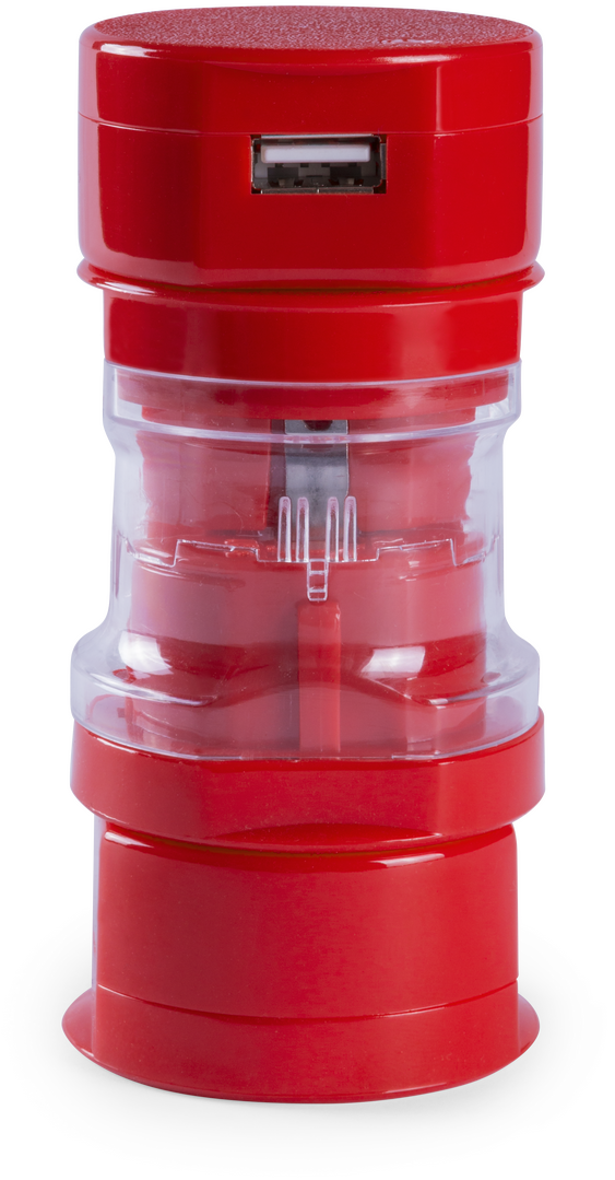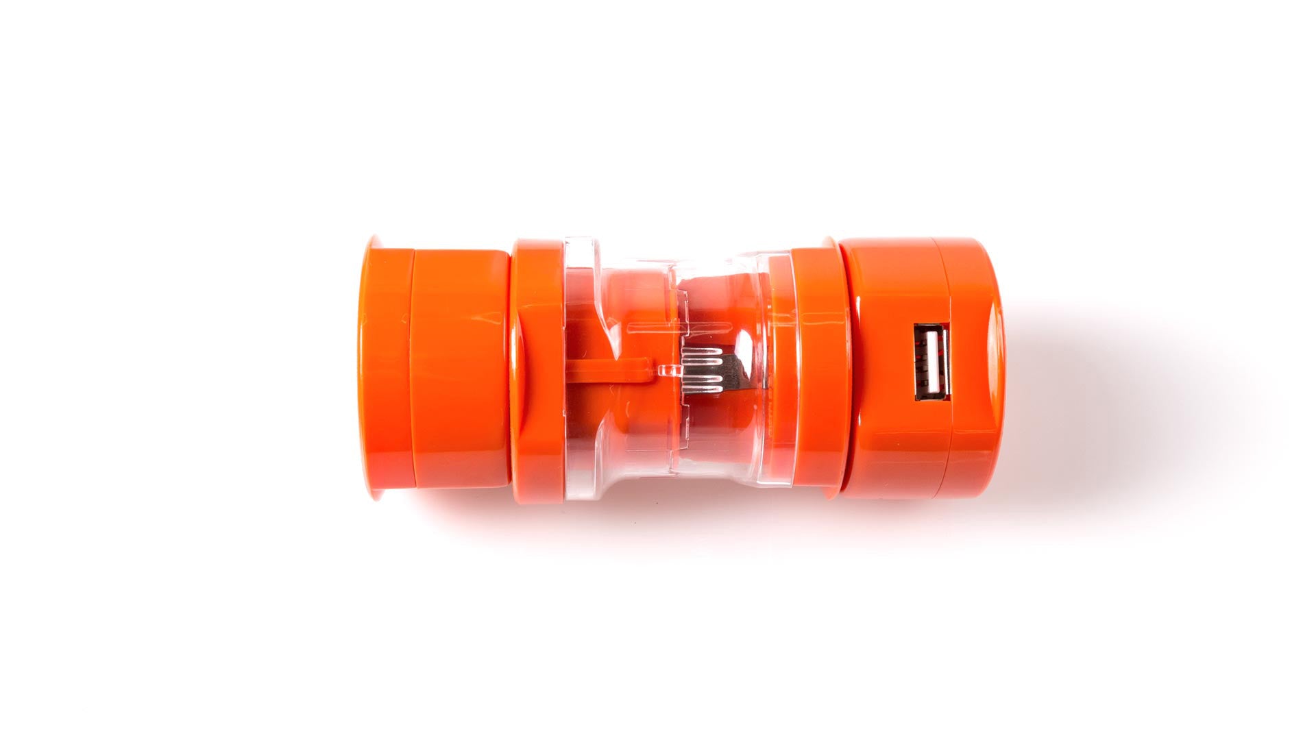 Adaptador de enchufes con salida USB de diseño compacto y portable, de 1.000 mA de capacidad de carga y en desenfadados colores. Especialmente indicado para viajeros, incluye adaptadores multi región para USA, Europa, Asia y Reino Unido. Presentado en caja individual.