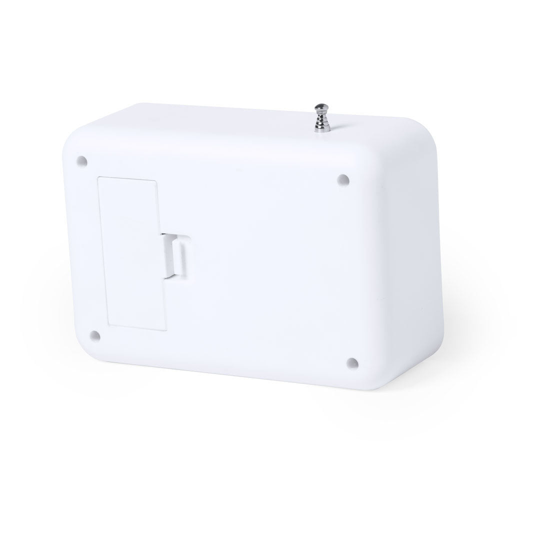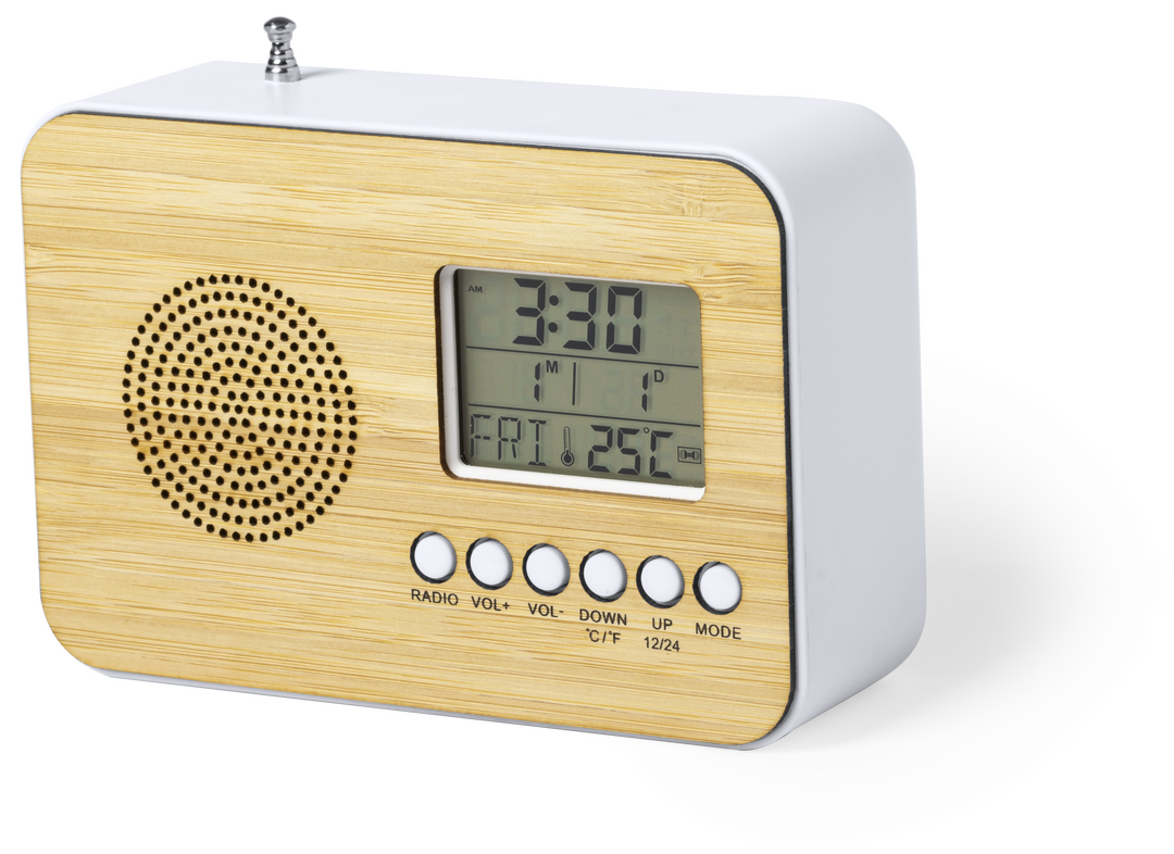Reloj radio de línea nature con frontal en bambú. Funciones alarma, calendario, termómetro y radio FM, con antena retráctil. Alimentación a pilas (2xAAA no incluidas) y presentado en atractiva caja de diseño eco.