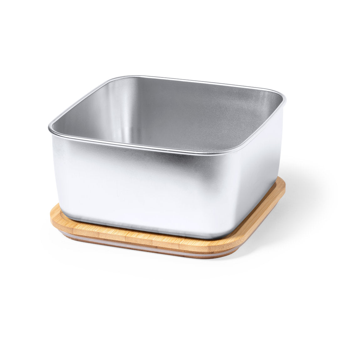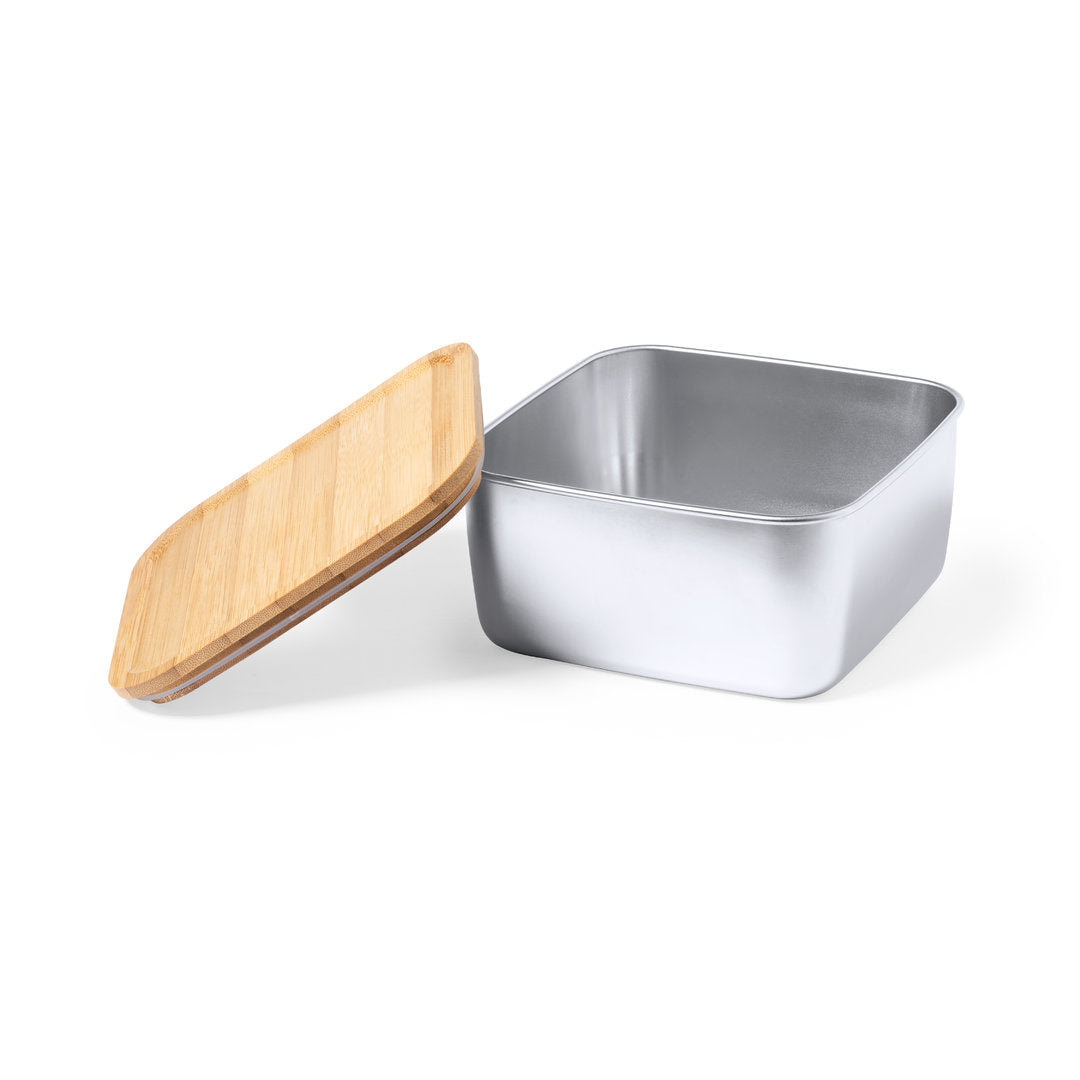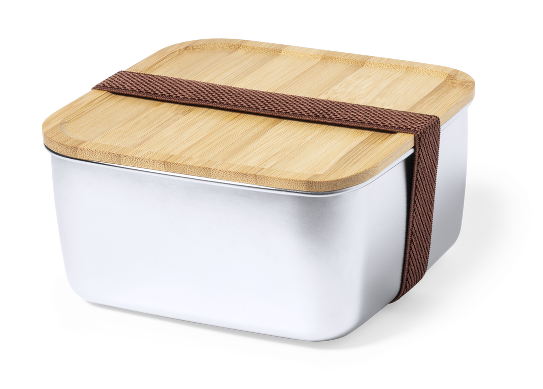 Fiambrera de 1,4 ml de capacidad y diseño cuadrado, fabricada en acero inox. Con tapa hermética en bambú y cinta elástica de cierre. Presentada en caja individual de diseño.