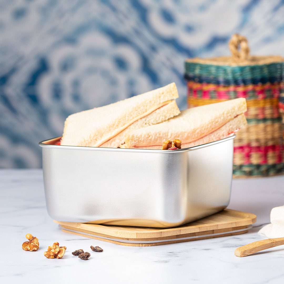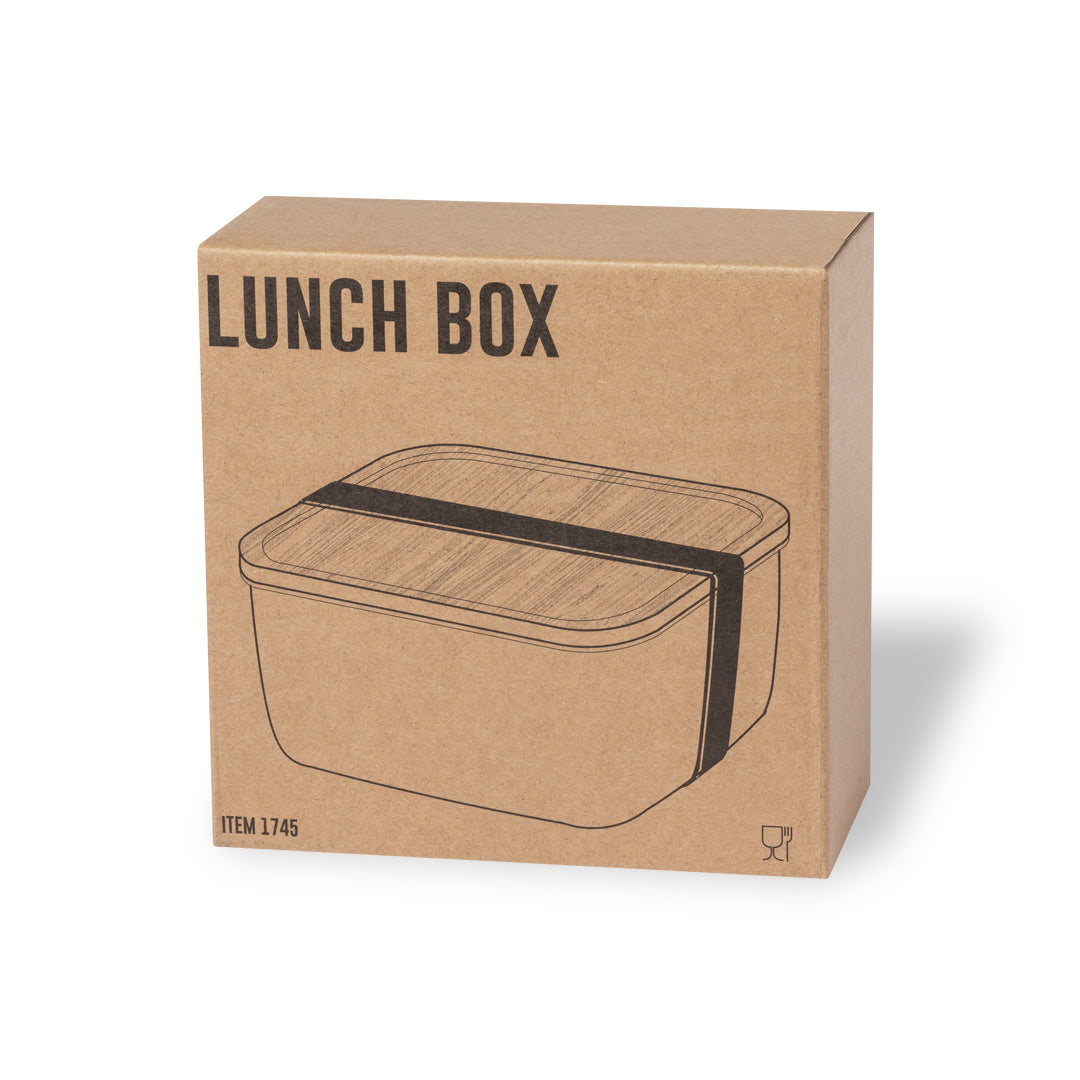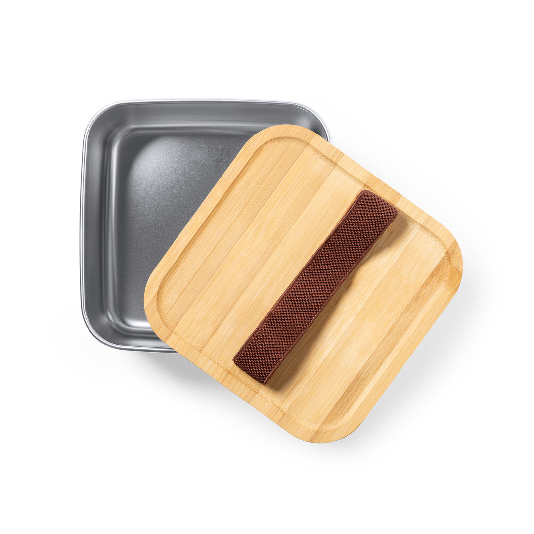 Fiambrera de 1,4 ml de capacidad y diseño cuadrado, fabricada en acero inox. Con tapa hermética en bambú y cinta elástica de cierre. Presentada en caja individual de diseño.