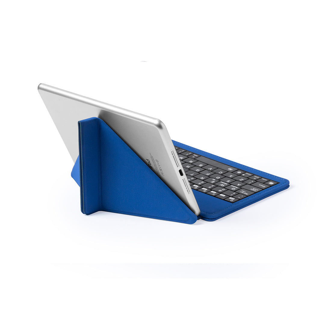 Teclado Bluetooth con función soporte para tablet en suave acabado de polipiel. De diseño compacto, en atrevidos colores y recargable mediante cable mini USB -incluido-. Compatible con cualquier sistema operativo y presentado en atractiva caja de diseño.