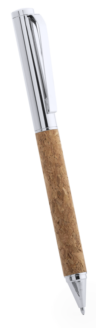 Bolígrafo de línea nature con cuerpo en corcho natural. Clip, punta y parte superior metálicos, con acabado cromado. De mecanismo giratorio, cartucho jumbo y con tinta azul. En estuche individual de polipiel con detalle en corcho e interior en suave antelina. Presentado en estuche de cartón negro.