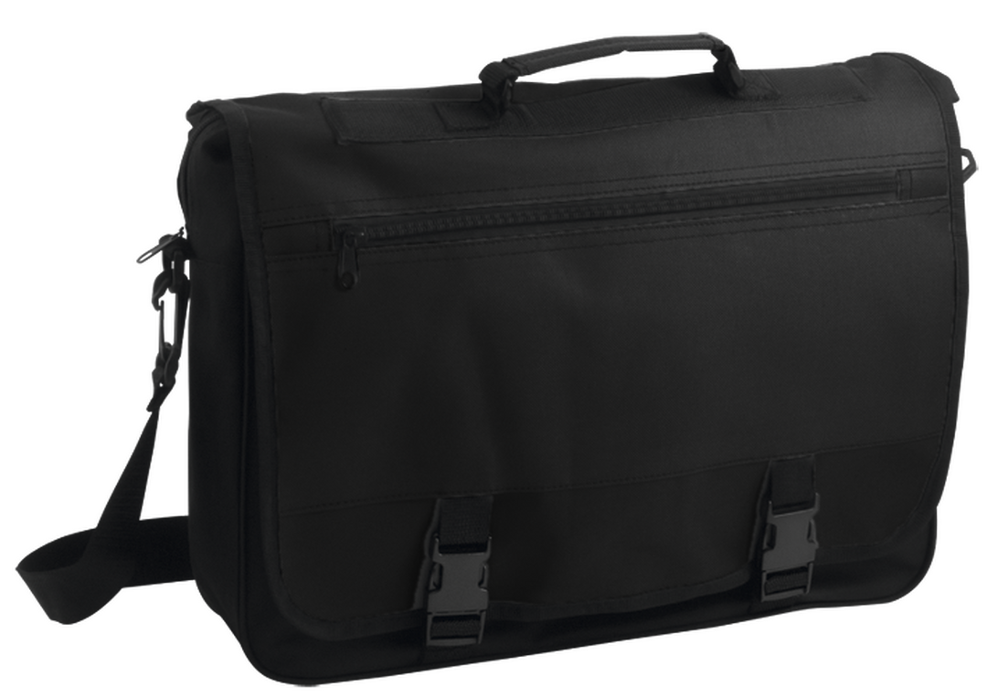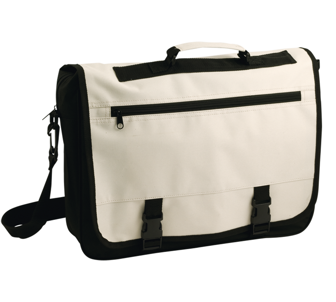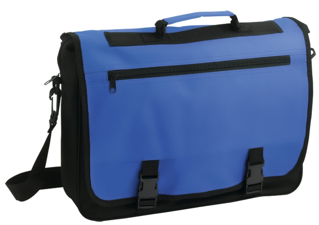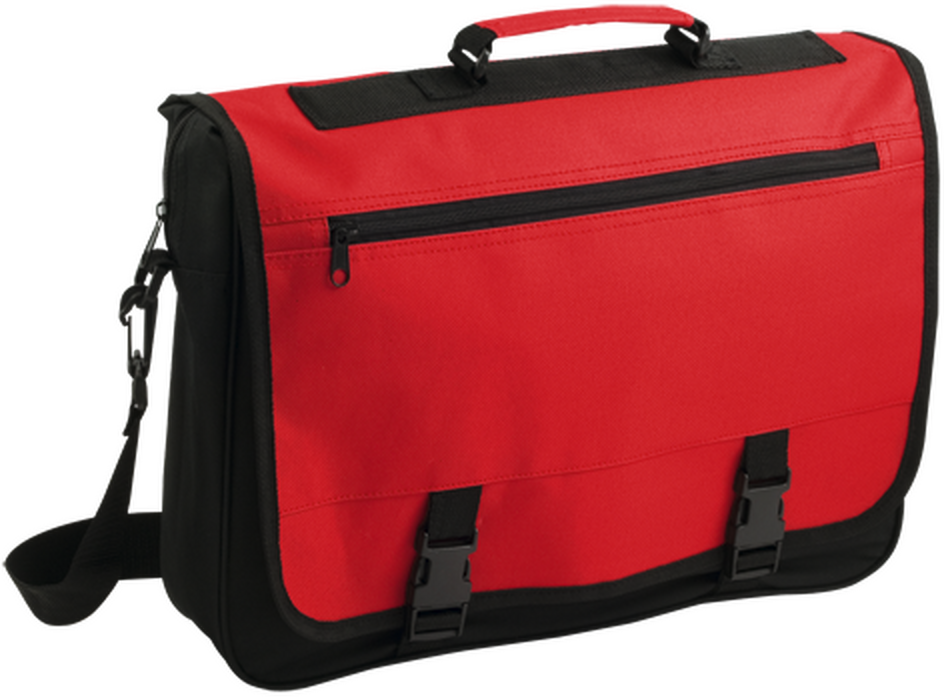 Portadocumentos con solapa de cierre de velcro en poliéster 600D con elegante tira frontal en color negro. Con asas de transporte reforzadas y cinta bandolera ajustable. Compartimentos interiores para bolígrafos y funda para smartphone en PVC con función táctil.