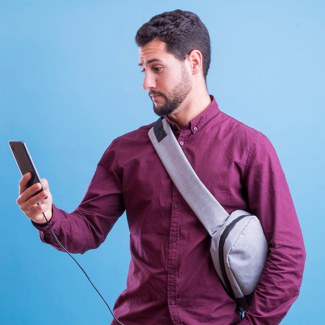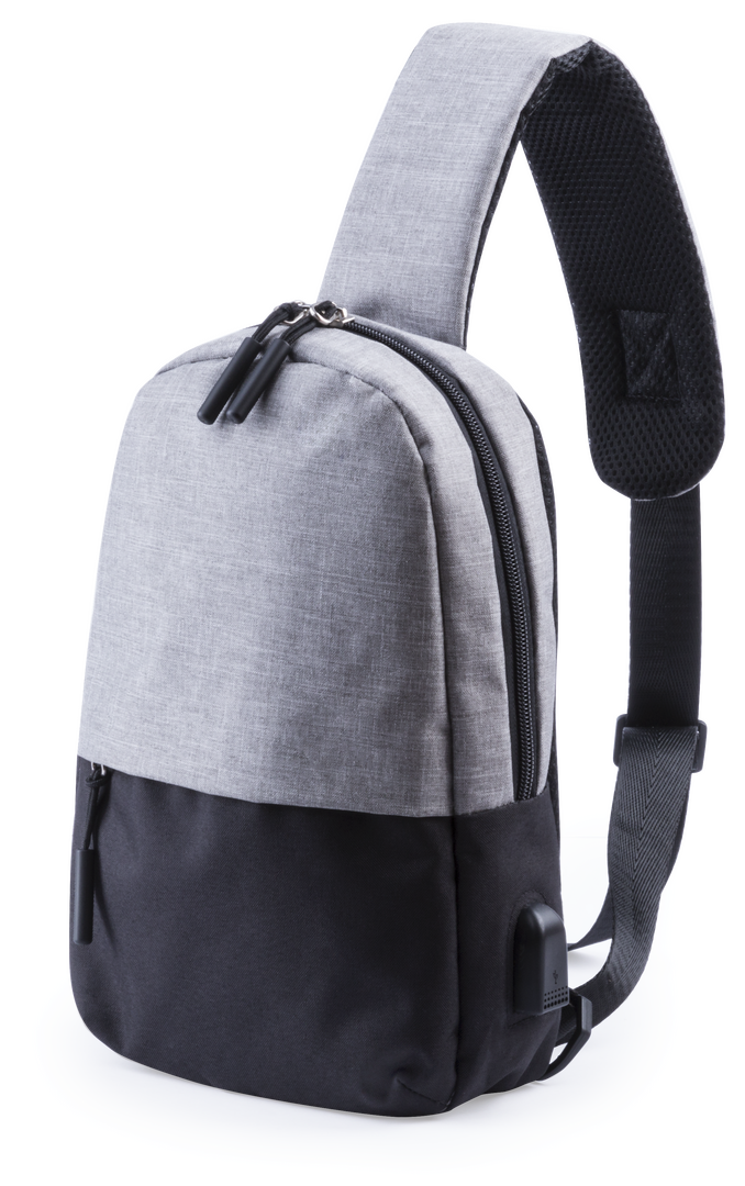Bandolera multiusos en resistente poliéster 300D. De atractivo diseño urbano, en combinación de colores gris denim y negro. Con conexión USB para carga -powerbank y cable no incluídos- y bolsillo acolchado para tablet de hasta 10 pulgadas. Espalda y cinta acolchadas, con cinta de ajuste regulable. Bolsillo principal de fácil apertura, con cierre de cremallera y resistentes tiradores.
