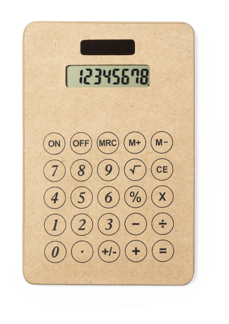 Calculadora de 8 dígitos de línea nature. Fabricada en cartón reciclado y funcionamiento con energía solar. Pantalla LCD y mecanismo de apagado automático. Presentada en caja individual de diseño kraft.