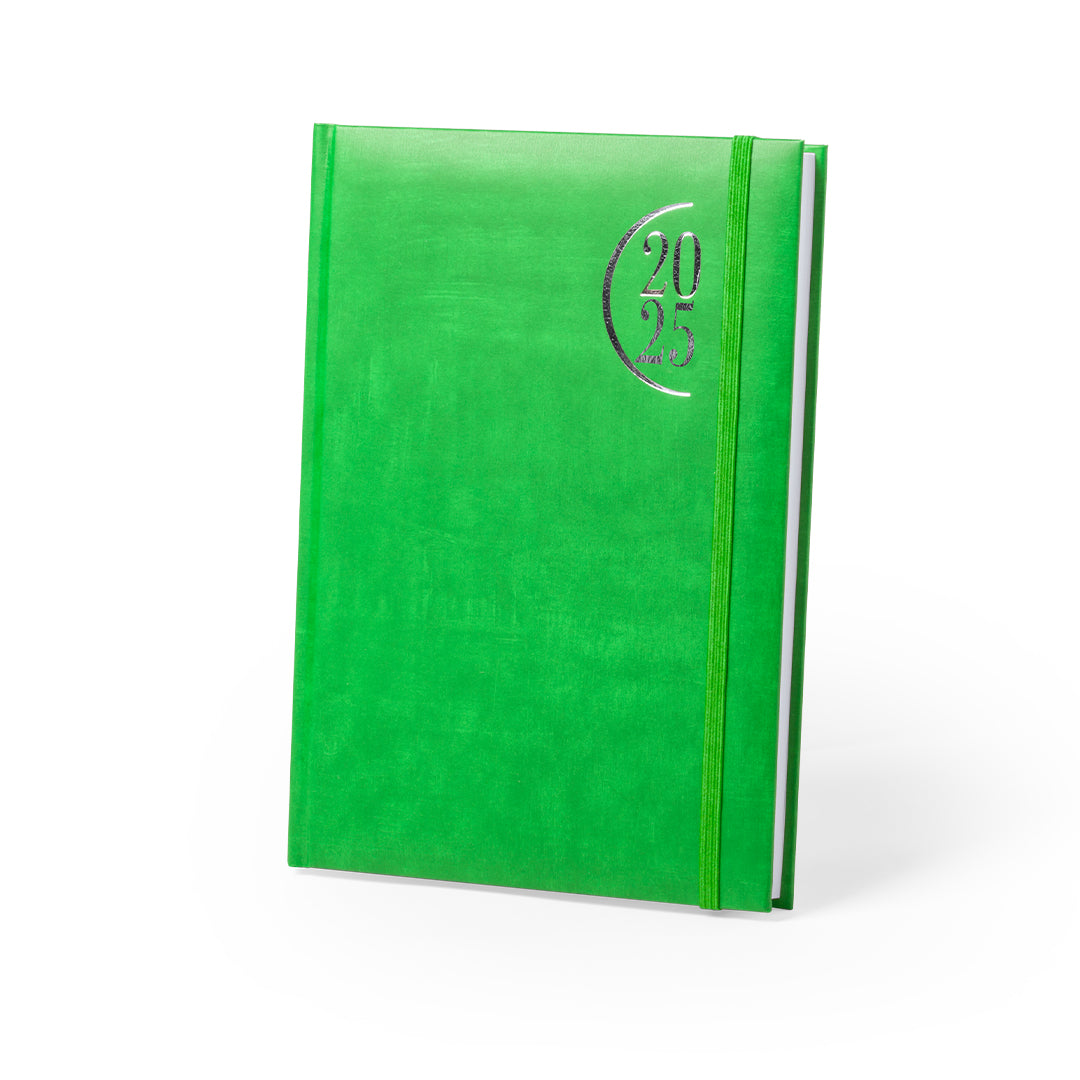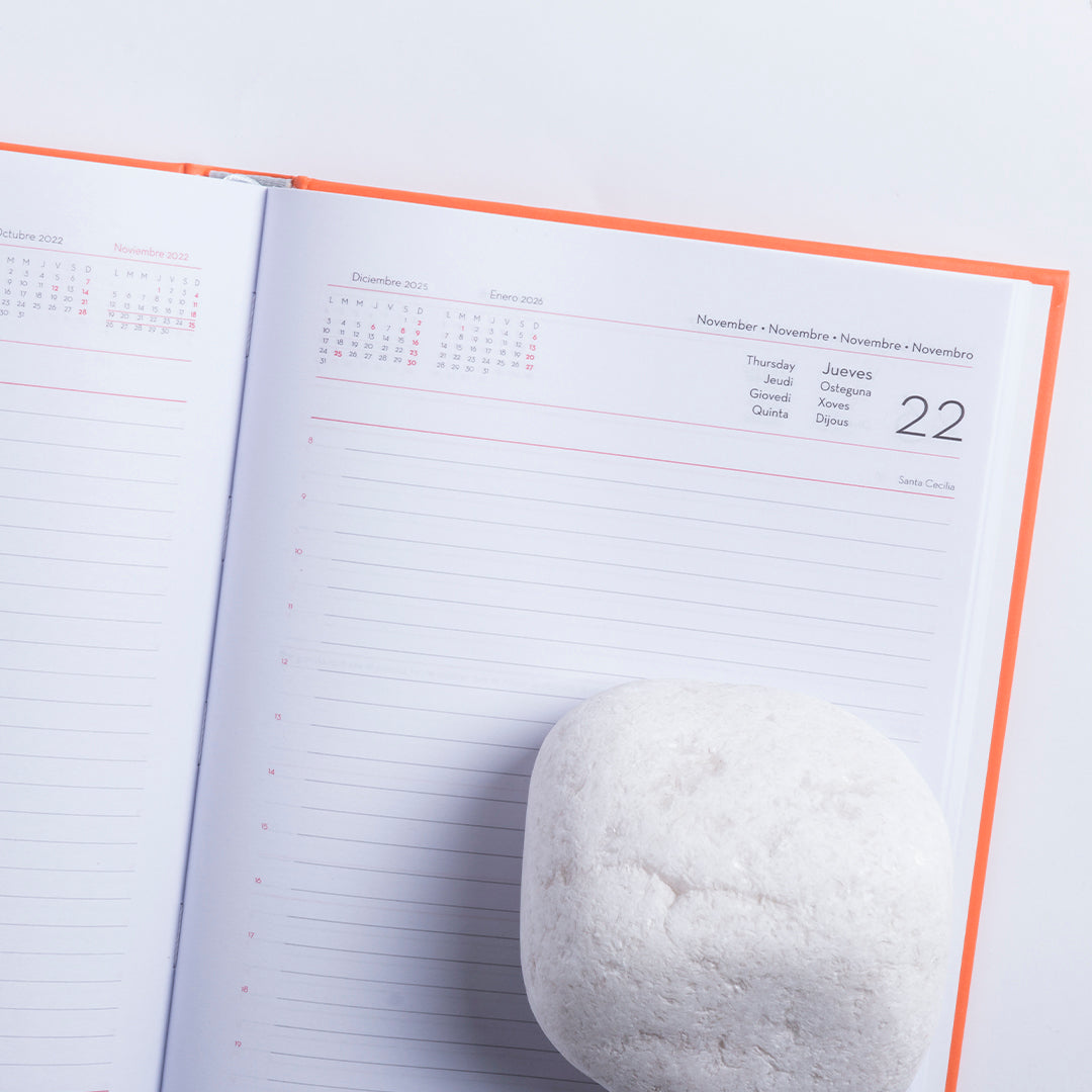 Agenda de tamaño A5 acabada en resistente y suave polipiel con acolchado, con elástico de sujeción a juego. De cubiertas rígidas, disponible en variada gama de colores.Diseño página día. En 8 idiomas: castellano, inglés, francés, italiano, portugués, gallego, euskera y catalán.Fabricada con papel libre de cloro elemental (ECF), que reduce de manera drástica la contaminación en el proceso de blanqueado de la pulpa del papel, consiguiendo una excelente calidad en el acabado final y, al mismo tiempo, garantizando el proceso de reciclado en múltiples ocasiones.