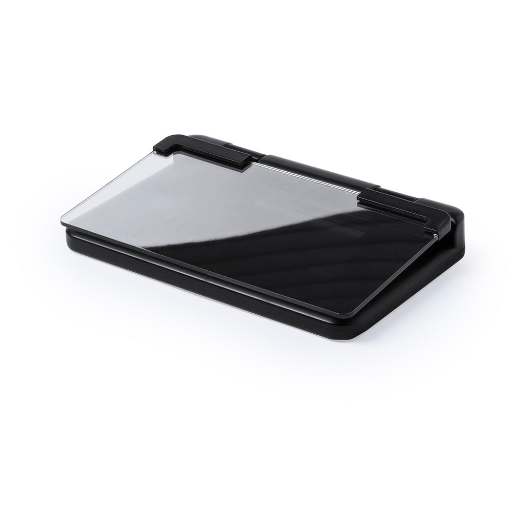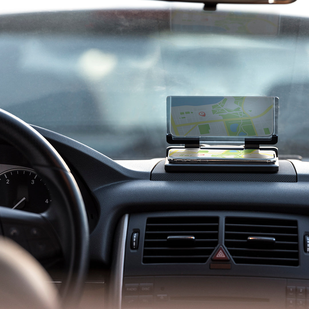 Pantalla soporte para automóvil. Con espejo duplicador de imagen ajustable y superficie anti deslizante ultra adherente para salpicadero y smartphone. Presentado en atractiva caja de diseño.
